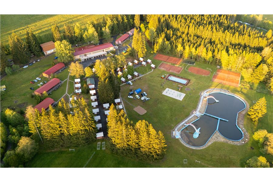 - Pokoje (2 až 5 lůžek) ve 3 hlavních zděných budovách - každý pokoj má vlastní sprchu a sociální zařízení.
