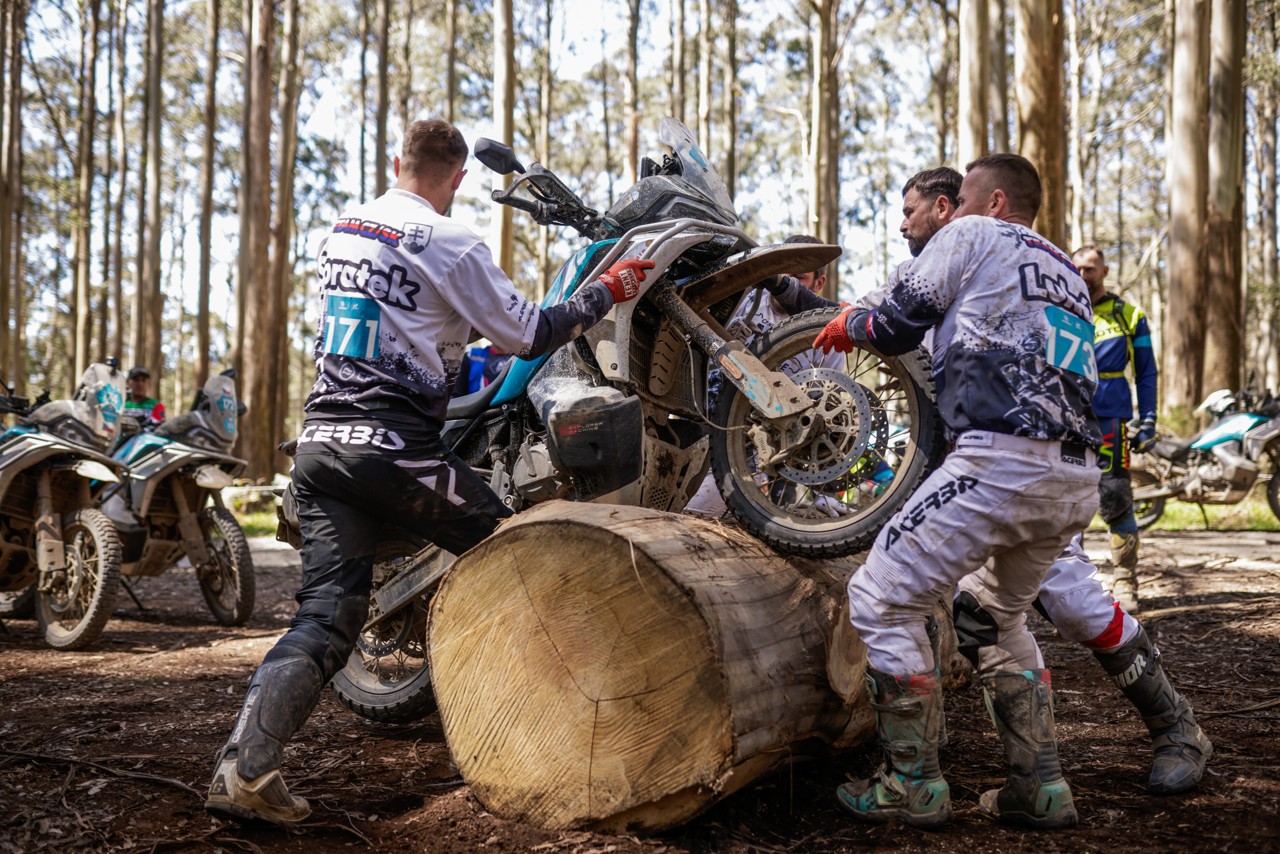 Dojíždíme na další test. Všichni vysmátí se spoustou zážitků sdílených přes komunikátor (mimochodem to by se klidně dalo vydat jako podcast). Na zemi tu leží asi metrový kmen z pralesa a před ním a za ním je čára. Cílem je přenést přes něj všechny motorky s vypnutým motorem. Vzali jsme to strategicky a využili toho, že jsme dobře stavění český kluci a s časem 48 vteřin se zařadili hodně dopředu ve výsledkách.