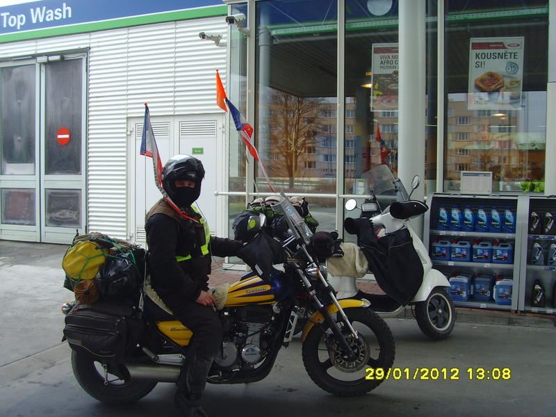 Letošní rok nám mnoho prostoru k tréninku nedal, neboť sníh napadl teprve před desíti dny, a tak si musíme vystačit s naučenou technikou z roku loňského. Opět vyrážíme s Pavlem na stejných strojích (Kawasaki Eliminator a Vespa) a máme o jednoho člena navíc. Je jím kamarád Bob, vedoucí lídr našeho jízdního klubu SCRC, který si právě pro tuto expedici pořídil krásný sidecar ruské výroby s názvem Dněpr.