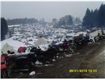 Naše oblíbené místo z loňska je volné, a tak sundáváme bagáž a jdeme se ubytovat. Rozděláváme stany na místě, kde je kopeček a kde je též i centrum dění a takové „vřídlo“, na kterém se, s přibývající hladinou alkoholu, mnoho majitelů motocyklů snaží vyjet několik terenních vln. Mráz tenhle vršek pěkně zledovatí a to pak bývá teprve zajímavé... Někteří účastníci srazu a některé stroje to prostě nedají.