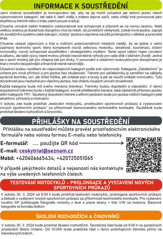 Jarní trialové soustředění bude v termínu 29. - 31. 3. 2024 v areálu Ontario Kyselka u Karlových Varů.
