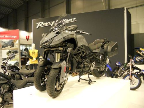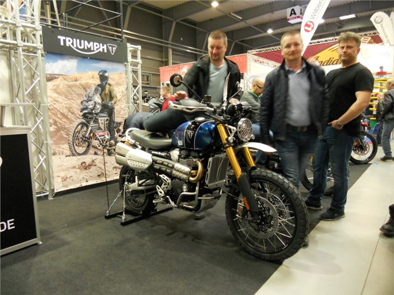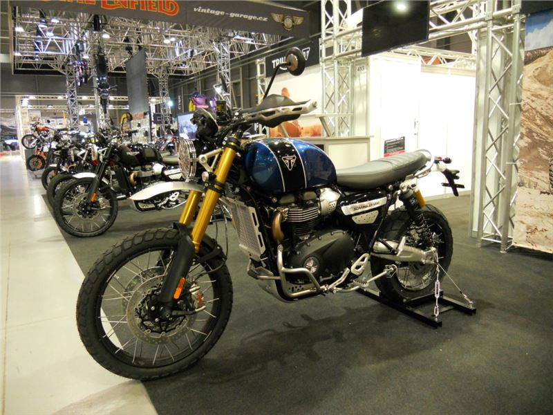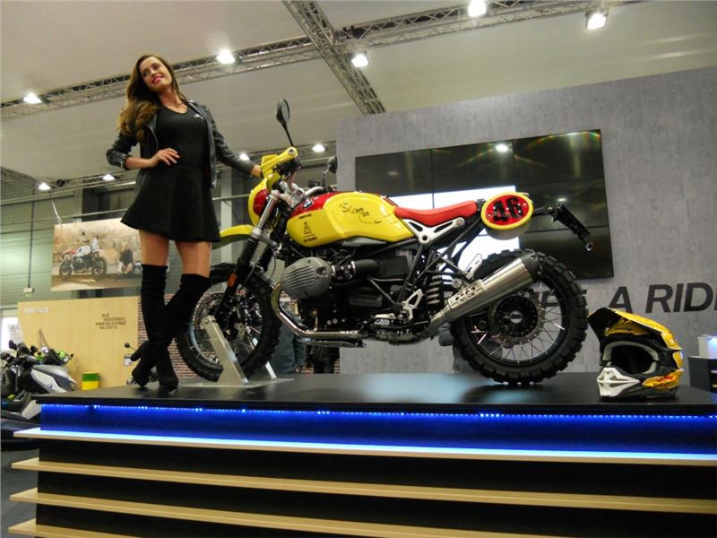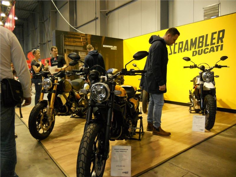 Na stánku je krom motorek možné okukovat i spoře oděné dívky, které jak tvrdí okolostojící, k motorkám prostě patří. Nová dvojice Scramblerů 1200 nese označení XC a XE. Na první pohled trochu úlet s předním kolem 21 palců, ale jinak asi plnohodnotné enduro v trochu nezvyklém kabátě. K vidění jsou i další moderní cestovní modely, nechybí však ani modernizovaná devítistovka Street Scrambler.