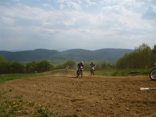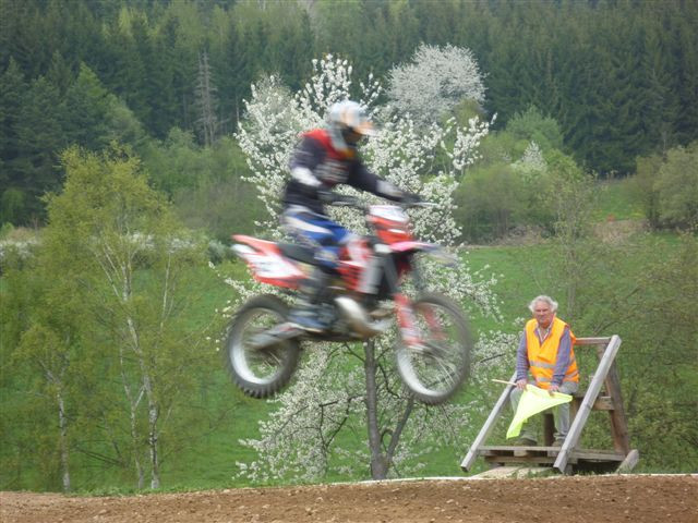 Tady se dozvídám, že měl pád a bolí ho koleno. Motokros je náročný sport, a to i pro peněženku. Zatne proto zuby a jede. Fandím, fotím, mávám. Umístil se na krásném posledním místě - lepší než bejt průměr :-)