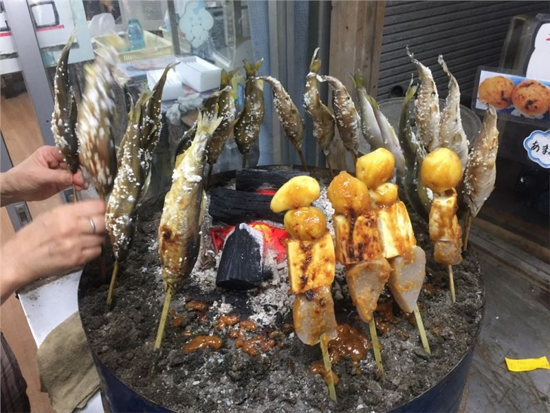 Ještě že restaurace nejsou zavřené. Do jedné s Yoshim jdeme. Zde se jídlo podává formou švédského stolu, mám tedy možnost ochutnat kde co. A šmakuju si náramě. To můj nový kamarád se s tím ale nerozpakuje. Trocha zeleniny a pak jen stejky.
