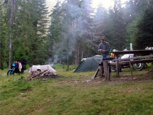 No nedá se nic dělat, musím se vrhnout na mokrej stan. Copak o to, zvenku ani tak moc mokrej není, zato na vnější plachtě zevnitř, tedy tam je zkondenzované vody že až. Zápolit v jednom s ohromným tropikem, a zrovna tady, kde není až tak moc místa, to je jako boj Lákoontův s hady. Tancuju s mokrým hadrem jako s vlky a až asi na třetí pokus se mi podaří ten mokrý hnus zformovat do jakž takž akceptovatelného tvaru a velikosti. Všechno si postavím i složím sám, s tím problém není, jen složit tropiko v jednom je něco jako Rubikova kostka. Hlavně že když jsem spolčenstvu před startem říkal, že tohle logicky bude moje slabá stránka při táboření, tak se mi dostalo mnohého ujišťování, že mě přeci vždycky někdo pomůže. Skutečnost? Prdlačku, vašnosti, pouze jednou v Branu helfnul Honza, jinak nic....mno, doprošovat se nemíním.