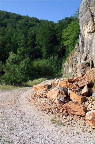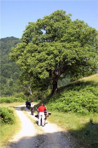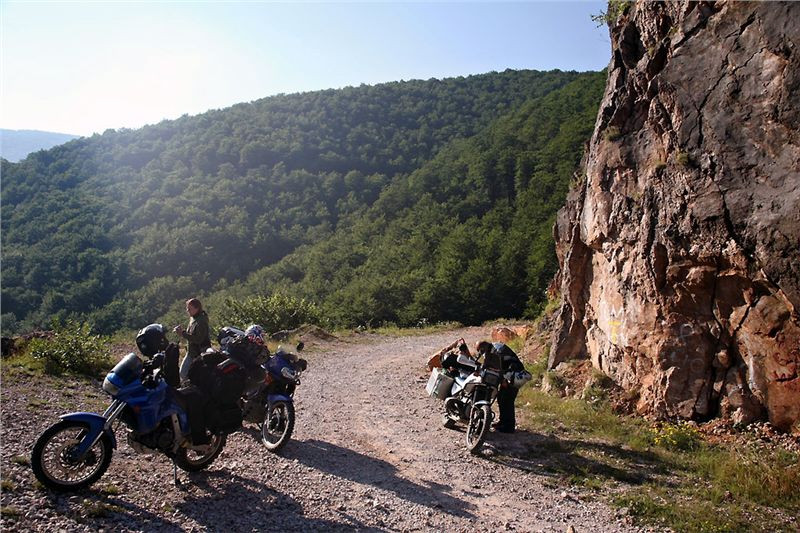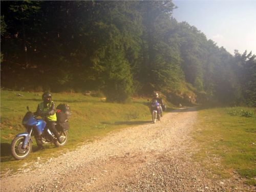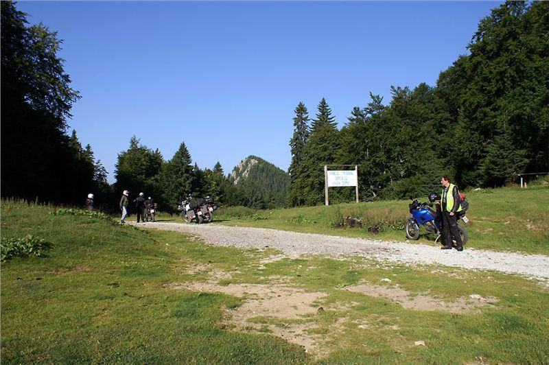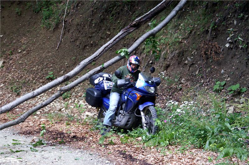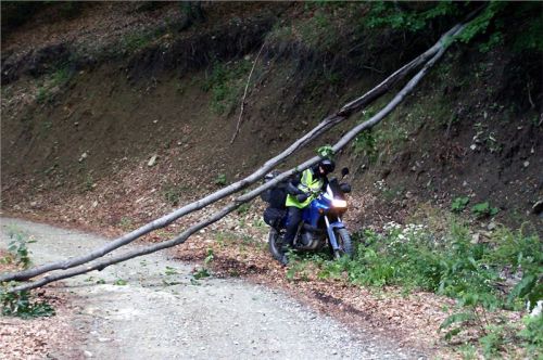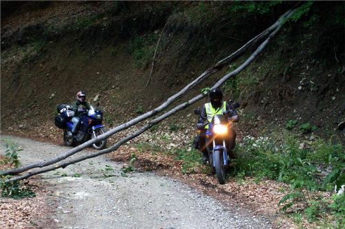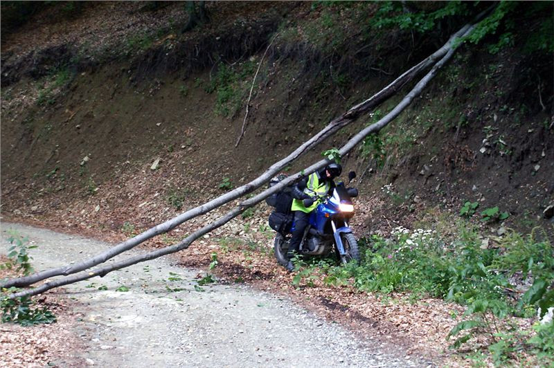 Jakmile opustím prudký a skalnatý sjezd, už je daleko líp. Cesta se trasově zklidní, takže se už jede víceméně v pohodě. O pár kilometrů dál mě na chvilku zastaví dva padlé stromy přes cestu, za nimiž čekají Belšani. Chtělo by to sice motorovku, ale motorka se může protáhnout bordýlkem podél svahu. Neprodleně tak činím. Ač tlust, protáhnu se bez potíží a pak jen čekáme na zbytek grupy. Ti také zvládnou stromy, takže míříme i nadále do údolí.