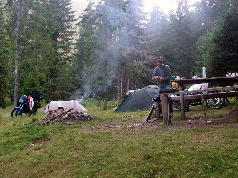 Předtím ale dám pořádnou snídani – jak je chládek, hnedle mi líp chutná. Ešus horkého čaje, řádná porce lovečáku se sýrem, z kufru vyčaruju poslední tatranku, skoro mám chuť si dát ranního panáčka, pak ale na to zrezignuju, neb nemaje parťáka, samotnýmu by mi nechutnalo a navíc, možná bych sklidil opovržlivý pohled od antialkoholového načalstva. To totiž, jak si bystrý čtenář jistě všiml, moc lihovým požitkům nepropadá. Jo, bejt tady Sim nebo Ranža, či alespoň paní dochtor, tož to by bylo jiná... :-).