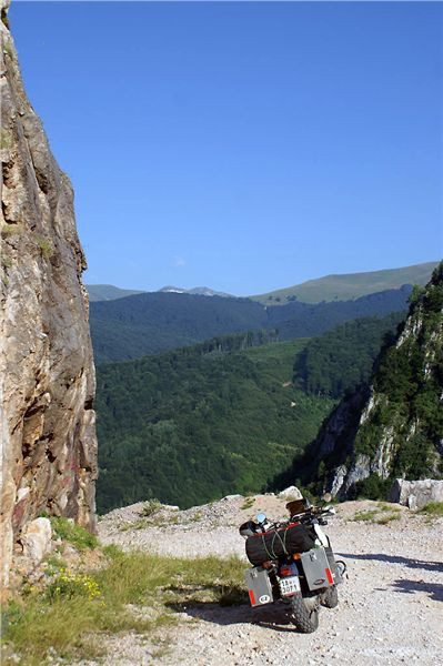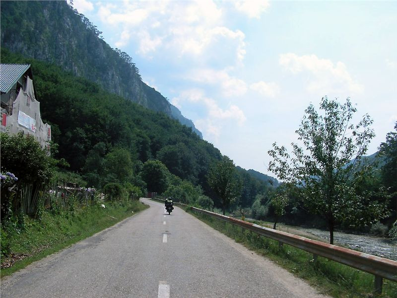 Za Băile Herculane se napojíme na hlavní údolní E70. Poezie nedotčené přírody zůstává kdesi za námi, před námi je odpolední, rozpálené údolí, kde o kousek svěží zeleně skoro člověk nezakopne. I když jedeme těch osmdesát – devadesát, člověk se stejně potí. Blahořečím intuici, která mě doma ponoukla hodit do kufrů při balení cyklistické rukavice, „bezprsťáky“. Teď a tady přichází jejich čas. Při zastávce u pumpy (pumpař s kámošem si pěkně v bermudách a triku hoví ve stínu a jsou evidentně happy, zatímco my, navlečeni v motocyklovém, no škoda mlčet:-(..) je tasím, normální jdou pro tentokráte do zálohy. A kupodivu, docela to pomáhá, chladněji na rukou a hned se jede líp. Eva, ta už delší dobu jezdí bez rukavic, ale tak brutální nejsu, na mašině se prostě bez rukavic cejtím tak nějak nepatřičně.