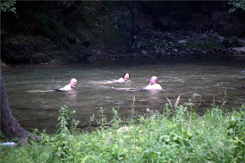 Všichni kromě Honzy (ten už zase chrápe) tak vnoříme své bělostné trupy (působíme tady s tou barvou trochu nepatřičně, inu měšťáci, buržousti z dekadentního Západu) do sice dosti ledové, ale o to více osvěžující vody. Neplaveme, jen se zuby nehty držíme kamenů, bychom neskončili posléze někde v Dunaji. Sice tam chceme, ale pozdějc a jinak:-).