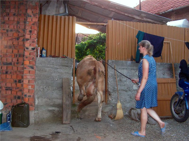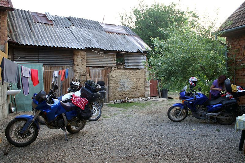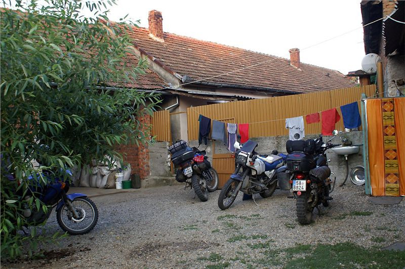 Podvečer si vyplníme sprchováním, relaxací, večeři z vlastních zdrojů (já na veškeré jídlo peču, koblížek s kafem bohatě stačil, hlavně furt piju...), Honza se vydá s foťákem po vsi ulovit pár večerních záběrů. Tohle všechno je na chvíli přerušeno návratem dvou kravek z pastvy, vezmou si to přímo přes dvorek mezi mašinami a obratně se protáhnou vrátky na vedlejší prostranství. Taky strávíme kus času povídáním s paní domácí, dozvídáme se podrobnosti z historie i současného života bezesporu zajímavé a svébytné české enklávy uprostřed balkánského orientu. Ale to by bylo na delší psaní, snad někdy jindy a někde jinde ....