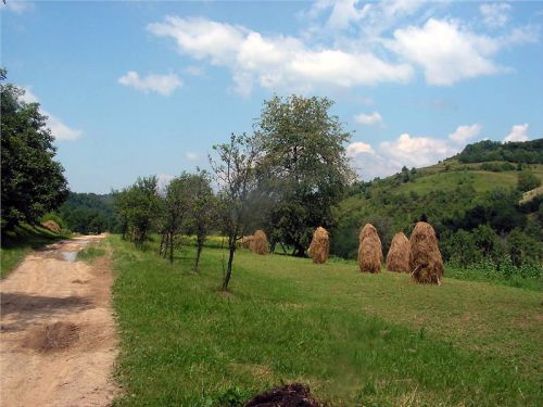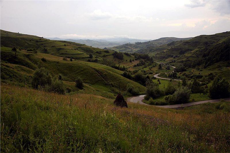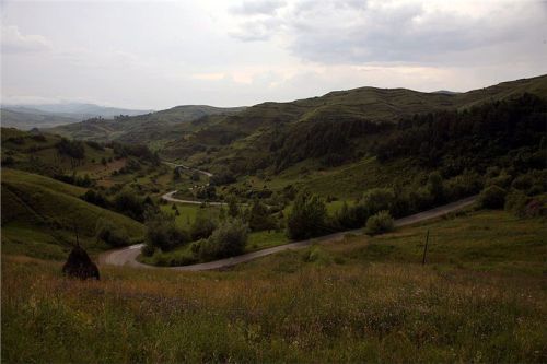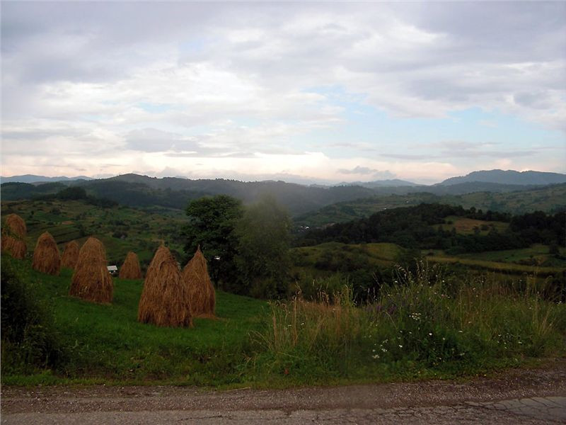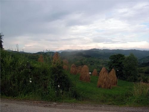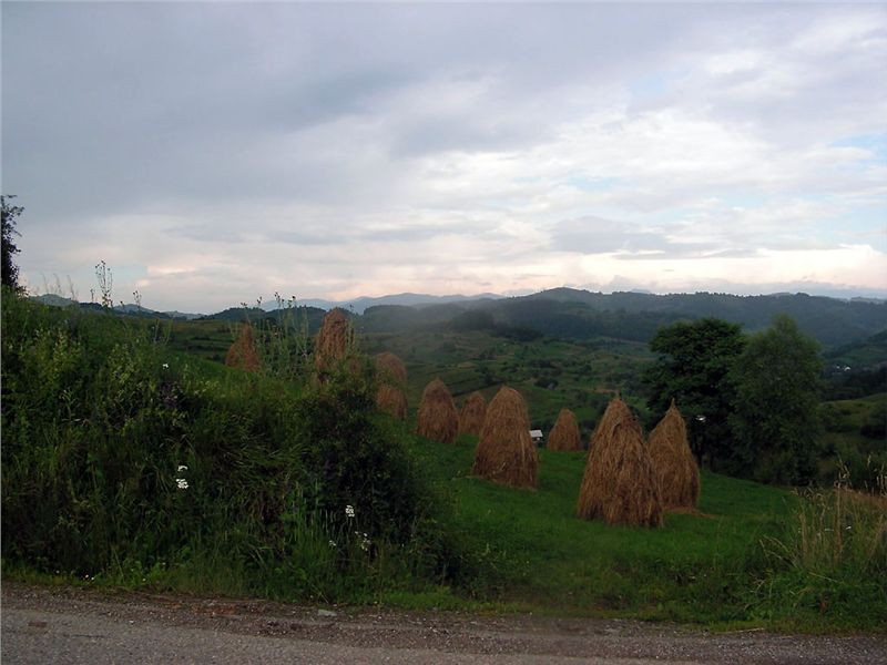 Cestu zpět si zkracujeme přes Bocicoel, zase podle mapy po hodně vedlejší silnici. Prima, buď projedeme, nebo se vrátíme. Bude dobrodrůžo. Silnice je ale moc pěkná, žádné vzrůšo se nekoná, jen ty pohledy kolem, to je paráda. Znovu stavíme, fotíme. Honza říká, že by tady vydržel týden se toulat po kopcích a fotit. V sedýlku máme projeté hory za námi s údolíčkem jako na dlani a před námi další údolí. Okolo na kopcích panáci slámy, ale jinak, než u nás kopky. Zřejmě je sláma pověšená na kůlu s ponechanými bočními větvemi. Z každé kopky tedy kouká vzhůru klacek. A často jsou u silnice „Boží muka“ s čerstvými živými kytkami. Je tady fakt pěkně a dnešní vejletík cca 200 km stál za to. No a zítra – zítra se již suneme dál po vyhlídkové silnici přes Borsu na východ k Vodometu a dál. Je na co se těšit.