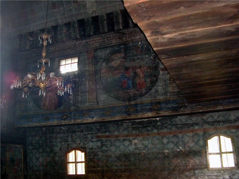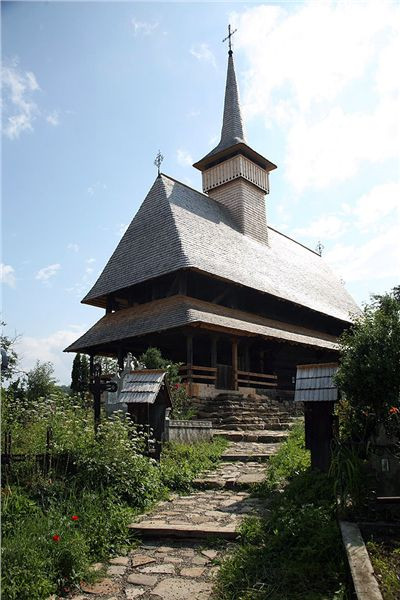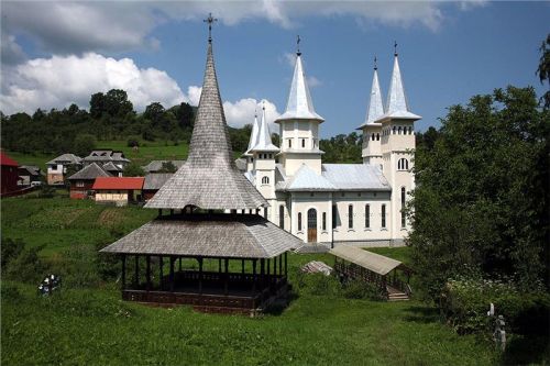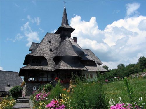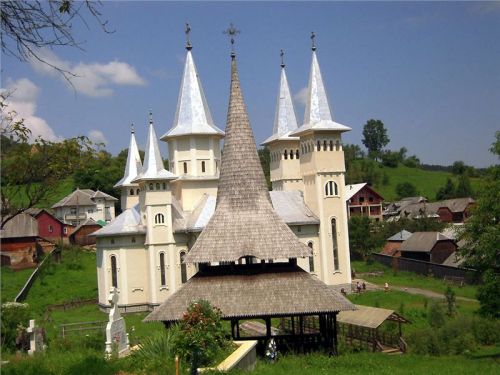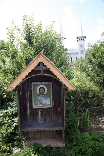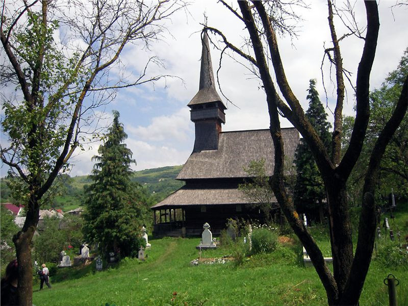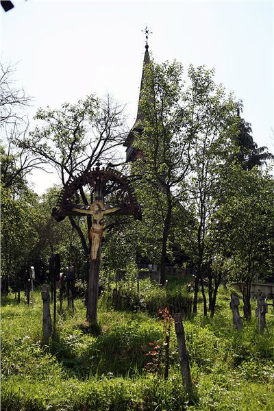 Za Bohdan Voda odbočujeme směr Botiza k UNESCO starému kostelu ve vesnici Poienile. Fakt pěkný, také se starým hřbitovem. Prolézáme okolí, fotíme, oddychujem, protože je vedro. Ovšem hned vedle znovu postavený nový kostel, v kterém právě je plno lidí. Přes potůček mezi kostely dřevěný mostík. Zase ženy v pestrých sukních se šátky a koukám, dokonce pár mladých holek na 10 cm podpatcích. Snaží se jít po té prašné cestě do kopce (rovina tu nikde není, jsme v pohoří Maramureš/Tiblesului).