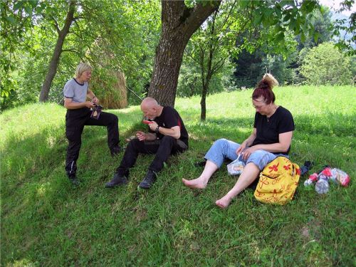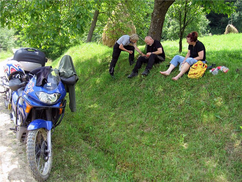 Teď volíme dále cestu v mapě jen slabě značenou. No co, když to nepůjde, vrátíme se. Tedy stoupáme po prašné cestě, chvílemi kamení, koleje, občas mokro. V jednom místě zahrabu zadní kolo do bahna po včerejším dešti. Prosím ostatní, ať mi pomohou ven. Povedlo se, již jsme na hřebínku a sjíždíme, motorku mám jak po motokrosovém závodě. Zuzka při tlačení dostala spršku z louže. Chvílemi musí jit, ve dvou to nejde. Jinak ale jedou s Jindrou stále ve dvou - kdo umí, ten umí... Tam, kde se klepu strachy, Jindra bravurně bez zaváhání jede. U potoka obědváme, já rybičky, odpočíváme. Byla to pěkná terénní vložka. Snad to již k asfaltu není moc daleko.
