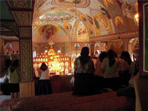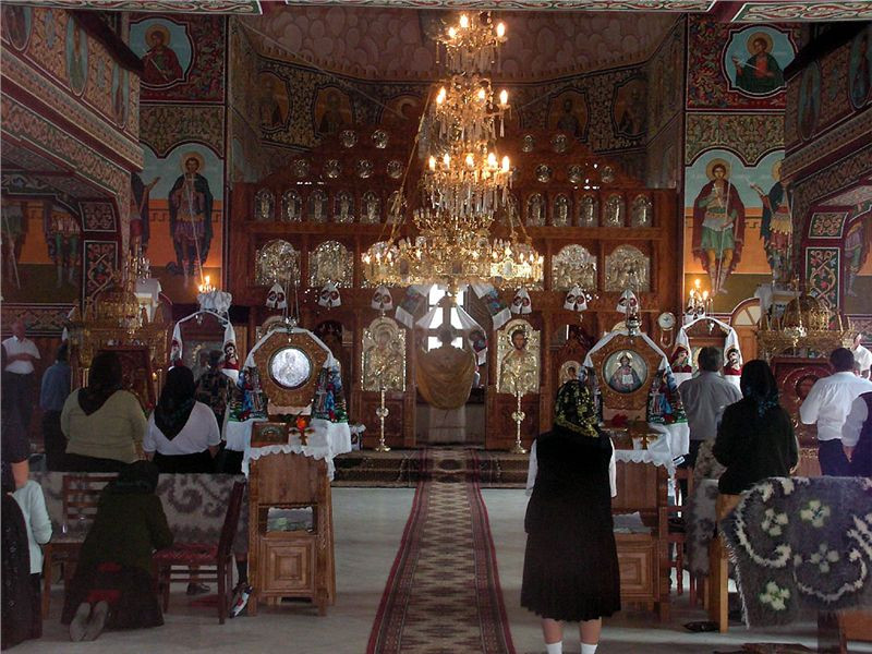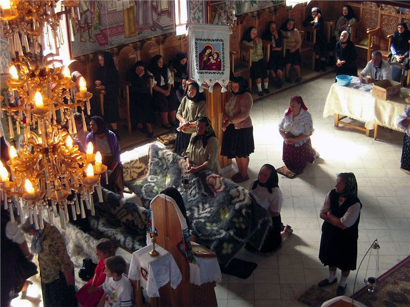 Ve vesnici Salistea de Sus stavíme u velkého kostela Sv. Petra a Pavla a jdeme se podívat dovnitř. Pokud nás pustí. Pustili, a vevnitř je to opravdu pěkné. Pozlacené obrazy až po strop, kde nejsou obrazy, jsou pomalované dřevěné stěny, uprostřed ohromný několikapatrový skleněný lustr, na stolečku napečené buchty velikosti chleba. Na zemi pěkná dlažba s koberci. Někdo klečí. Ženy v barevných či černých sukních, světlé halenky, přes ně svetr, na hlavě černý šátek se vzorem, boty nízké s ponožkami, mladší i boty s podpatkem. Muži v černých kalhotách a bílých košilích. Zastoupeny všechny věkové kategorie včetně dětí. V kostele je docela plno, mše je v plném proudu. Necítím se tam moc dobře, proto jdu ven, ale Jindra pronikl až do patra, fotit mu dovolili. Tam, na místě, kde u nás míváme varhany, také stojí lidé.