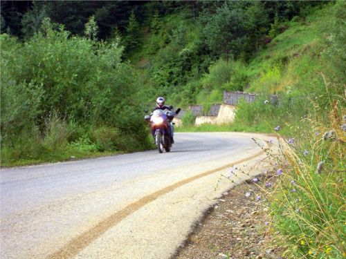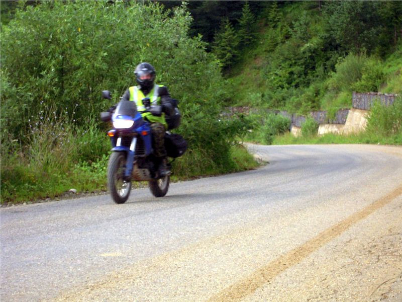 Když jsme zamávali Jirkovi, který odjel na svou železniční vyjížďku, vyrážíme nalehko (bágly zůstaly v penzionu, jen Honza musí s brašnami, neb v levé veze benzin pro svou malou nádrž a v pravé vyvažovací kanystr vody) vpřed na vyjížďku. Trasu předem Jindra nalezl a čeká nás prozkoumání okolního pohoří.