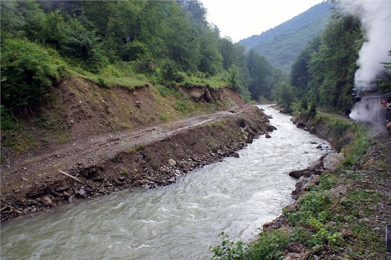 Rychlost tak není velká, pohybuje se podle GPS mezi deseti a patnácti kilometry za hodinu. Ale ani o ni nejde. Spíše jde o malebné a divoké údolí, zprvu lehce osídlené, posléze je zde ale pouze divoká řeka, lesy a dráha. Lesní cesta už zmizela, občas se podél trati objeví koleje od terénních aut – když to nejde jinak, mizí v korytě řeky, aby se po pár set metrech opět vydrápaly na břeh. Poznamenal bych, pro naše houževnaté enduráky by tohle mohla být docela výzva