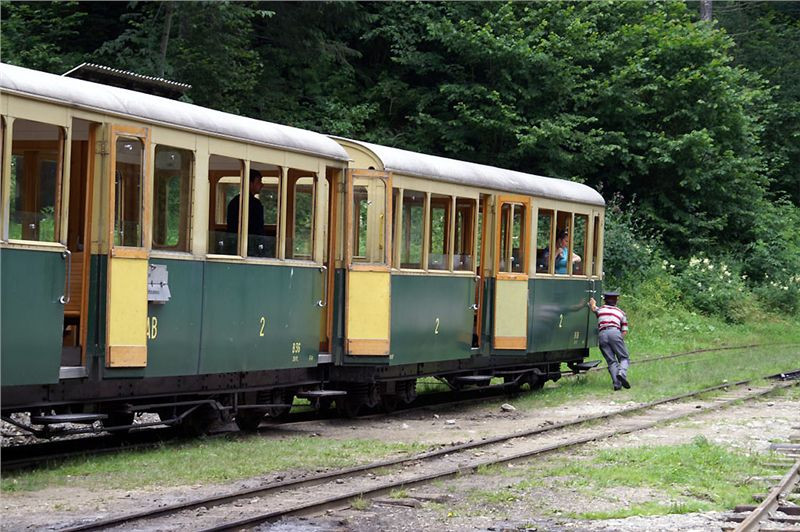 Dolů jedeme víceméně samospádem, na některých úsecích se dokonce musí činit brzdaři v jednotlivých vozech. Souprava totiž není průběžně bržděna jako naše vlaky. Každý vůz má brzdaře, který poslouchá signály píšťalou a podle nich přitahuje nebo povoluje brzdu. Kdo je starší a jezdil v Praze starejma tramvajema, určitě si pamatuje brzdící kolo v každém voze – zde je to némlich to samý... A třikrát si vyzkoušíme i nouzové brždění – pasoucí se krávy a koně je nutno po zastavení z trati odehnat. Je jasný, že na jeden či dva průjezdy denně si dobytek špatně zvyká...