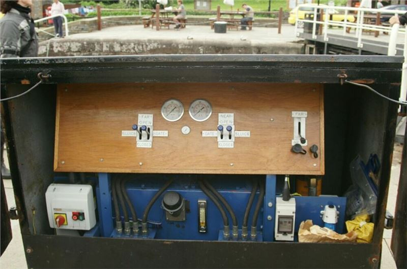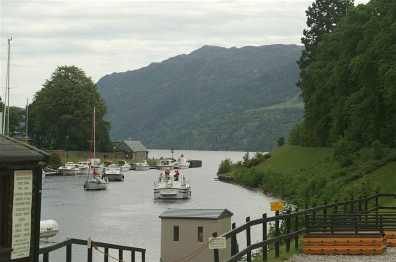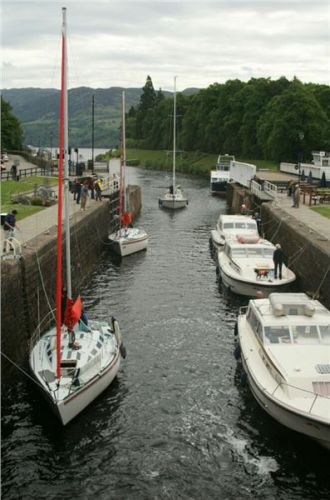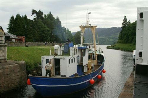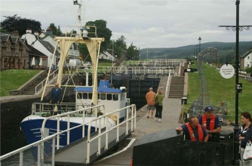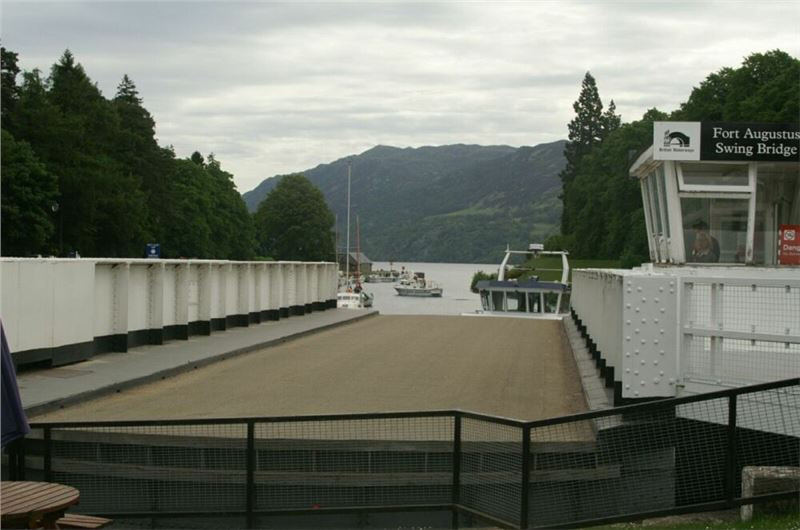 Poměrně rychlou a i širokou silnicí zamíříme sérií klesavých houpaček k jižnímu konci jezera, kde leží středisko oblasti. Ještě před ním ale stavíme na malém parkovišti před zavřeným hotýlkem a pubem, kde jsme svědky Jiříkovy snahy o přízemní akrobacii. Inu, kombinace štěrčíku a akce přední brzdy je zrádná. Naštěstí hrozící náklon končí opřením o vedle stojícího baworského ingota pod úhlem skoro pětačtyřicetistupňovým. Takže, dnes beze ztráty kytičky JPár kilásků a před námi je Fort Augustus, kde dáme přestávečku. Jednak je nutno natankovat, druhak se vydáme na prohlídku místní soustavy zdymadel kaledonského kanálu. Je to tu obdobné jako u Banavie, ale klidně si tohle dám ještě jednou. I zde je plný provoz, dolů putuje ošoupaný a ošlehaný rybářský kutr, na opačnou cestu čeká houf jachet u ústí zdymadel. Máme tak možnost vidět otáčivý most v akci. Jeho přesun z jedné do druhé polohy netrvá dlouho, takže zdržení řidičů není až tak velké. Dále mohu pozorovat i činnost obsluhy u externích ovládacích pultů jednotlivých zdymadel, což mně jako technika zaujímá převelice. Jak tak mohu usoudit, vše funguje na starou poctivou hydrauliku, žádný elektronický švindl, moje krevní skupina... Strávíme tady skoro celou hodinku příjemným procházením po obou stranách vymydlených zdymadel, než se konečně hneme dále.