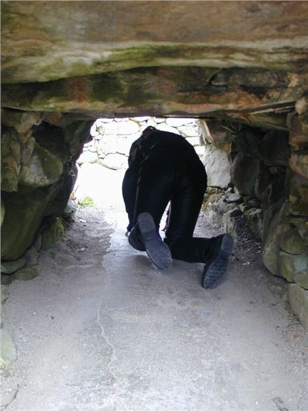 Odbočka a pár kilometrů navíc nás opravdu přivede až k oplocenému prehistorickému monumentu. Je jím v tomto kraji dosti rozšířená kamenná hrobka s pohřební komorou a vchodem, to celé obkrouženo kruhem minimenhirů. Takže si to jdeme v poklidném odpoledni prohlédnout. Já už tohle tak trochu znám z Bretagne, ale i tady je to dobrý a stojící za kratší návštěvu. Samo, nejvíce a nejšťastněji kolem krouží Jirka, dokonce se s Ladou vydají po kolenou dovnitř komory. Ta je oproti dřívějším dobám shora otevřená – původně zde ležel velký placatý šutr, kryjící celý prostor. Takže teď si oba mohli stoupnout. Zbytek jejich snažení pozoruje z důstojného odstupu.