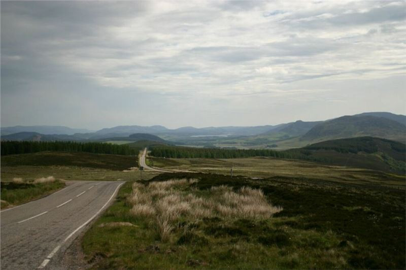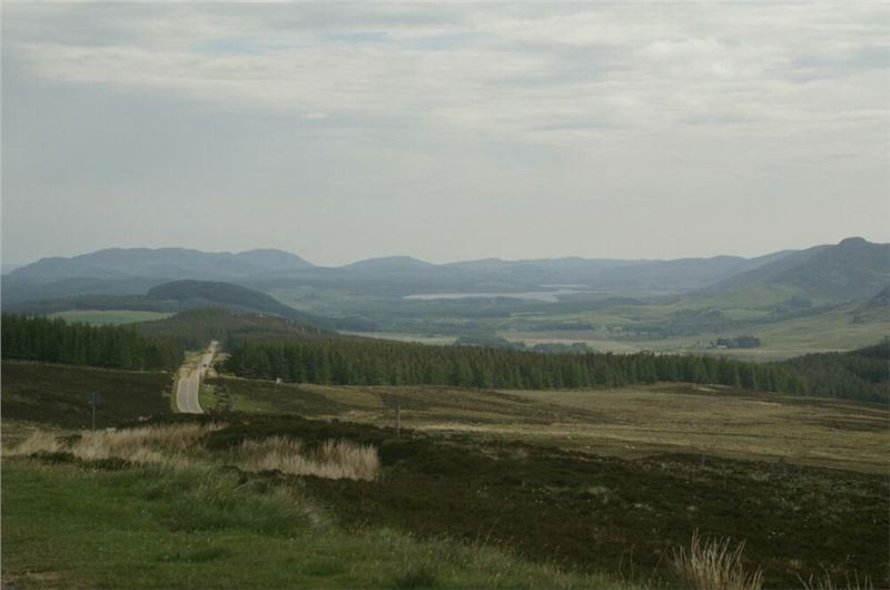 Ve Foyers naše cesta po pravém břehu Nessiiny louže končí, silnice nás vede vlevo nahoru do olysalých kopečků. Pořád mírně stoupáme, až se dostaneme na dominantní hřeben, kde na chviličku zastavíme na rozhled, foto a tak. Je vyfoukáno a vyčasíno, rozhled koldokola skotskou pahorkatinou je vynikající.
