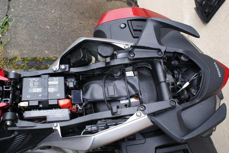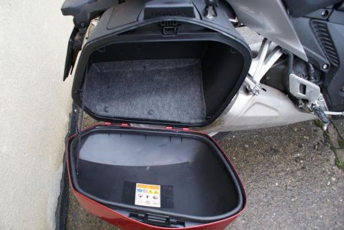 Testovaný kus byl vybaven firemními kufry v barvě motorky, které vypadaly docela elegantně. Jak ale bývá u „hondích“ kufrů časté, uvnitř jsou menší, než se zdají. Dal jsem do nich prázdný batoh, prázdnou tašku na moto oblečení, boty na přezutí, foťák a PET láhev a byly plné. Na krátké výlety to stačí, ale pro cestu po Evropě (nedejbože ve dvou) bych určitě potřeboval kufry větší. A navíc, zámek na jednom z kufrů šel odemykat špatně a na tom druhém ještě hůř, takže zpočátku jsem měl strach, že zlomím klíček. Jistě, na motorce předtím jezdilo už asi několik různých redaktorů, k tomu pršelo, bláto atd... Ale u téměř nové motorky s takovou cenovkou bych čekal, že by to nemělo vadit a že by se kufry měly otvírat zcela hladce. Tady asi zpracování trochu hapruje.