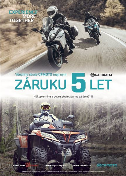 5 let záruka platí při nákupu od 30.3. 2020 do 31.7.2020 pro koncového zákazníka, který není podnikatelem. Týká se všech modelů z aktuální nabídky strojů CFMOTO oficiálního dovozce Journeyman CZ s.r.o.. Záruka 5 let platí v daném termínu pro všechny nově zakoupené stroje CFMOTO v prodejní síti Journeyman v ČR a SR.