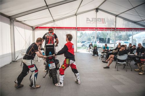 Předpověď počasí hlásila časté přeháňky a bouřky, ale pořadatelé akce mají tam nahoře asi dobré konexe a areálu se deštíky většinou vyhýbaly. Na druhou stranu, kdyby jakože pršelo fest, mohly by být testovací jízdy na endurech atraktivnější, díky častějšímu prokluzu zadního a nezřídka i předního kola :-).