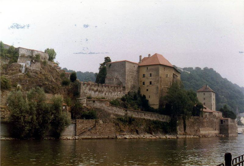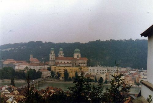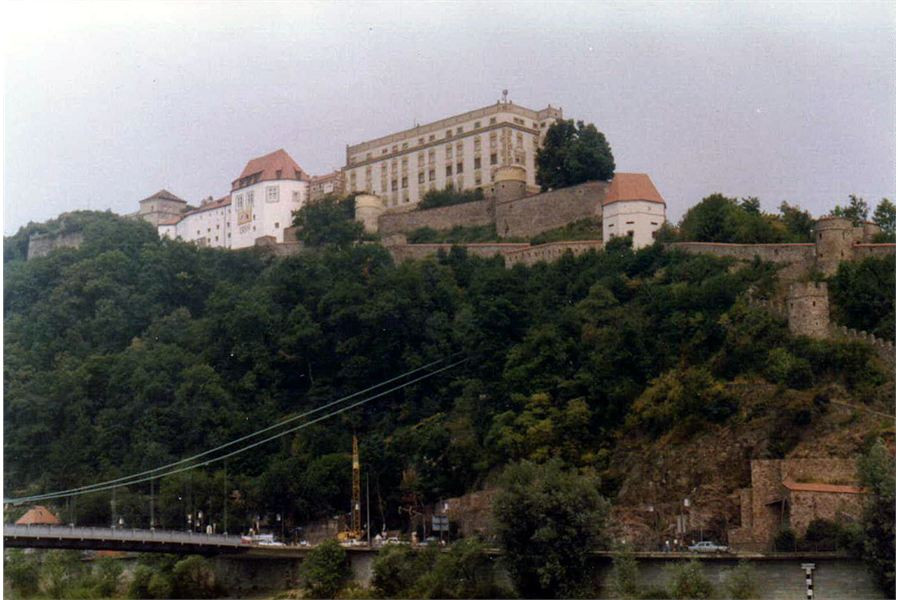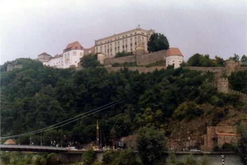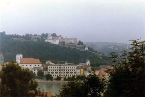 Vjeli jsme do Passau a hned na kraji vyjeli za město nahoru na kopec, kde je umístěn klášterní komplex, odkud je prý pěkný pohled na jádro města a soutok tří řek, Dunaje, Innu a Ilzu. Motorky jsme nechali na rozlehlém parkovišti svědčícím, že toto místo je dosti frekventované a vyšli jsme na krátkou obhlídku místa. Sakrální komplex je menší,udržovaný a dosti mi připomínal (až na ten stav) mnoho podobných u nás v Čechách. Za ním jsme vyšli na ostroh a chvíli pozorovali opravdu zajímavou scenérii pasovského historického centra. Bylo trochu zamženo, a tak fotografie nevyšly jak by měly, nicméně pohled to byl velice pěkný.