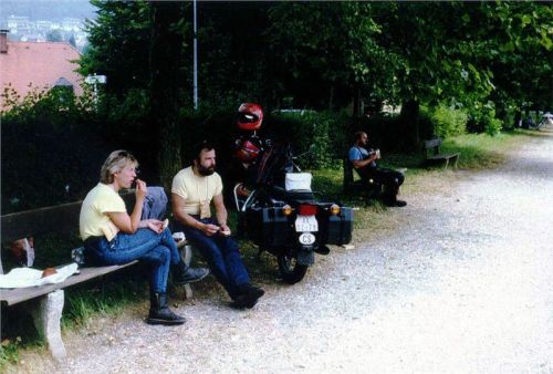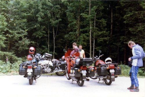 Příjemně osvěženi a odpočati jsme uvedli své stroje do chodu a vyrazili na další kus cesty. Sledovali jsme tok Dunaje až těsně k rakouským hranicím. Zde silnice odbočila od řeky a několika prudkými serpentínami vystoupala na úbočí nad řekou. Ještě několik kilometrů a byli jsme na jedné z mnoha typických malých celnic německo-rakouských. Tato byla v samostatné stavbě mimo lidská sídla, samozřejmě byla takřka prázdná až na svoji posádku a dvě děvčata na „padesátkách“, směřující také naším směrem do Rakouska. Ty byly asi místní a po několika slovech s úředníky jely dále. My jsme se chvilku zdrželi a museli alespoň ukázat pasy, protože tak exotické turisty (kromě Helmuta samozřejmě) na tak exotických motocyklech tu asi dlouho neměli. Po standardních otázkách o motocyklech a účelu cesty (je nutno přesvědčit západoevropské celníky, že mohou býti východoevropští cestující také jenom pouzí turisté) jsme pokračovali dál již opět po rakouské zemi. Jeli jsme po zapomenutých okreskách směrem k severovýchodu k českým hranicím. Malé vesničky (vždy perfektně upravené), kopce, silnice samá zatáčka a nahoru, dolů a nahoru, teď nikde ani auta, prostě motocyklová pohádka.