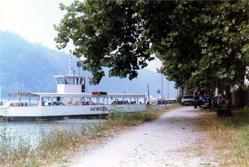 Strávili jsme zde asi půlhodinku. Pozorovali jsme při tom jednak opět připlouvající trajekt (je zajímavé, že byl dosti plný, i když jsou v blízkosti pasovské mosty) a jednak výletní loď, která připlula od Pasova a zakotvila u mola plovoucího vedle trajektového přístaviště.