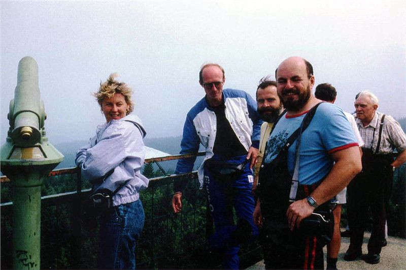 Krátké, ale kruté a táhlé stoupání nás dovedlo do lesa, jímž jsme po několika kilometrech dojeli až na parkoviště pod ocelovou, asi třicet metrů vysokou vyhlídkovou věží. Byli jsme ve výši 1046 m n.m. na vrchu Sulzberg, známému ovšem v okolí jako Moldaublick. Bohužel, mlhavé počasí nám nedovolilo daleké pohledy, a tak jsem ani na onu věž s sebou nebral fotoaparát. Po výstupu jsem si blahořečil, protože dohlednost byla tak asi dva kilometry horizontálně, takže byla sotva vidět rakousko-česká hranice a Lipno se ztrácelo v sluncem prozářeném kouřmu na obzoru.