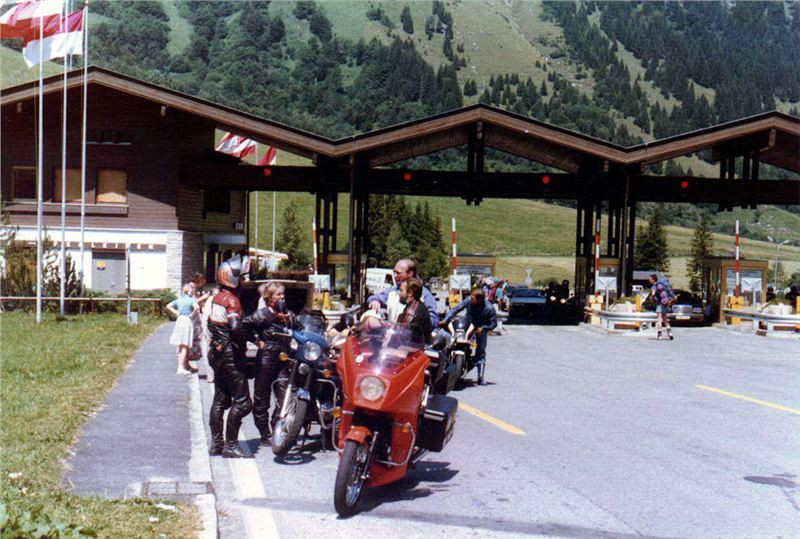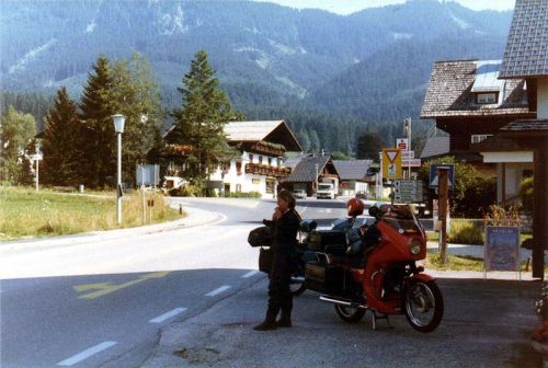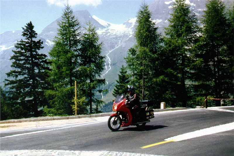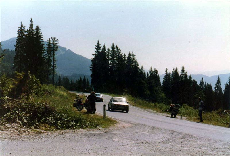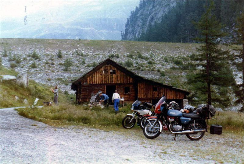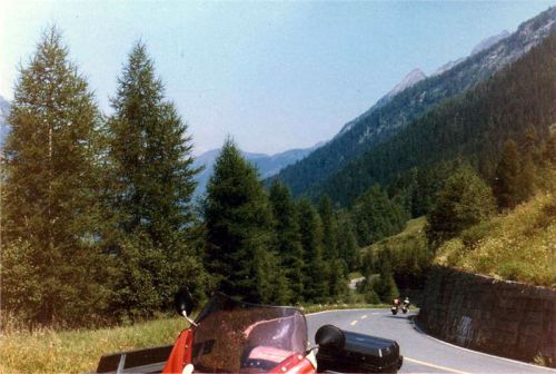 V tu chvíli už bylo jasno - silnice pokračovala zrovínka tou samou stěnou, co vedly ty mohutné trubky. A taky se samozřejmě přizpůsobila podmínkám. Zúžila se tak na tři metry, stoupání bylo určitě přes dvacet procent a každých padesát až sto metrů byla vracečka opravdu o stoosmdesát stupňů s vnitřním poloměrem takřka rovným nule. Pro nás to znamenalo, že řadit jinou rychlost než za jedna nemělo smysl. Zatáčku jsme vyjížděli s nadjetím do protisměru a jak jsme mohli pozorovat, Helmut se svým přeci jen delším motocyklem tam měl co dělat. Zde se projevily Jawy jako vhodnější díky svému velkému rejdu. Přesto nám Helmut ujížděl, i když ne zdaleka tak rychle jako na Grossglockneru. Já jsem držel zadní pozici do té doby, než Jiří zvolnil tak, že už jsem takřka nemohl pomaleji, a tak jsem jej předjel. Stoupali jsme stále pásmem lesa, občas jsme podjeli mohutné stříbřité trubky a za chvíli se mě osobně z neustálých vraceček začala motat hlava. Jawička šlapala stále bez problémů, až motor začal charakteristicky smrdět po přehřátém oleji, což bylo známkou, že hicuje nadoraz.