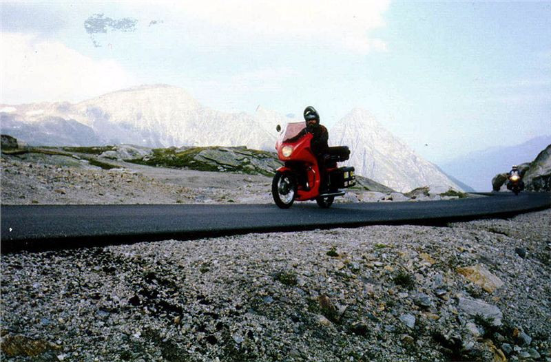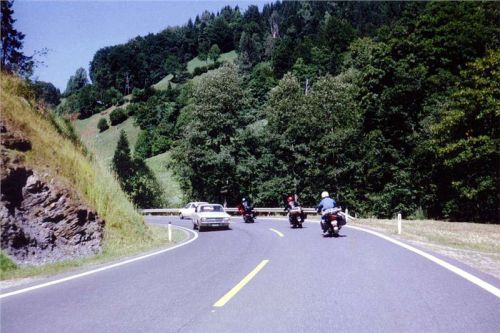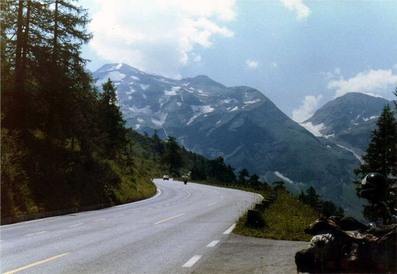Šlo to nad očekávání dobře, pořád na dvojku, jen v některých zatáčkách, zvláště těch pravých s menším obloukem, to musela vzít jednička. Omlouval jsem se motoru, když jsem jej poté vytáčel tak, aby se dvojka chytla, ale nedalo se nic dělat. Zatáčky (vracečky) jsou na této silnici číslovány od severu na jih. Po několika kilometrech, už na hranici lesa, jsem předjel kolegy, kteří stáli na parkingu a koukali po okolí a asi také na mne čekali. Já však jel dále s tím, že udělám několik žánrových obrázků svých kolegů na motocyklech v jízdě. Tak jsem pokračoval dál až asi k Edelweisswandu ve výši 2200 m n.m., 9 km od mýta. Od něj tedy silnice vystoupala o více než tisíc metrů.