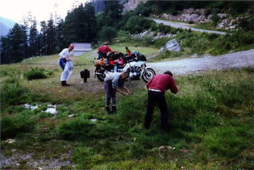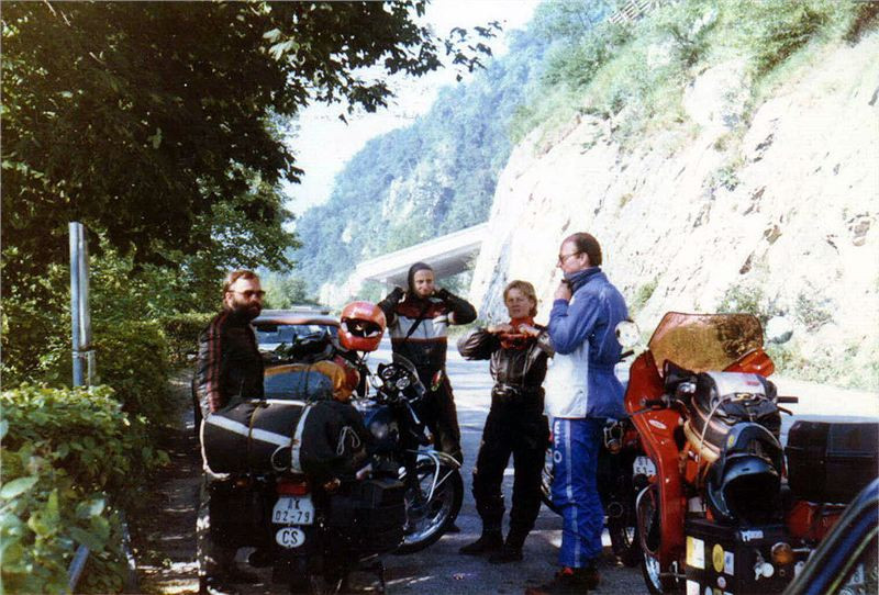 Uplynulo deset minut, pokochali jsme se scenériemi a jelo se dále. Tedy, Helmut s Tondou odjeli, Jiří nemohl nahodit, a tak musel mašinu pustit dolů kopcem, aby chytla. Když se vrátil, chtěli jsme jet dál, ale mě zase pro změnu šla mašina taky na jeden válec. Tedy svíčku dolů, otřel jsem ji, znova namontoval a ejhle, vše OK. Tedy asi pecka na svíčce.