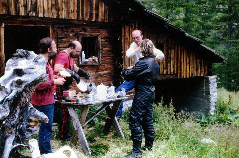 K tomu, abychom byli ukojeni po všech stránkách, chybělo ještě naplnění žaludku nějakou stravou. Byl čas, a tak se mohlo vařit něco teplého. Helmut samozřejmě, jako starostlivá chůva, nabídl svůj plynový vařič, ale v tomto směru jsme mu chtěli za každou cenu ukázat naši samostatnost, a tak jsme vytáhli naše osvědčené sovětské benziňáky. Zíral na to jako puk a zvláště rozdělávání ohně na něj, jakožto člena dobrovolného leondingského hasičského spolku, udělalo mohutný a nesmazatelný dojem... Sice říkal něco o ohněstrůjcích a pyromanech, ale se zájmem přihlížel, ovšem dlužno dodat, že z patřičné vzdálenosti. Benziňáky nezklamaly a po chvilce spokojeně hučely a vařily žádané. V mém případě to bylo půl pytlíku těstovin společně s konzervou lančmítu (tou malou maďarskou). Navrch jsem si uvařil ještě kotel čaje a vše s chutí splivnul a vypil. Teď teprve mi bylo bezkonkurenčně fajn. Ještě kdyby tu byla Jana....