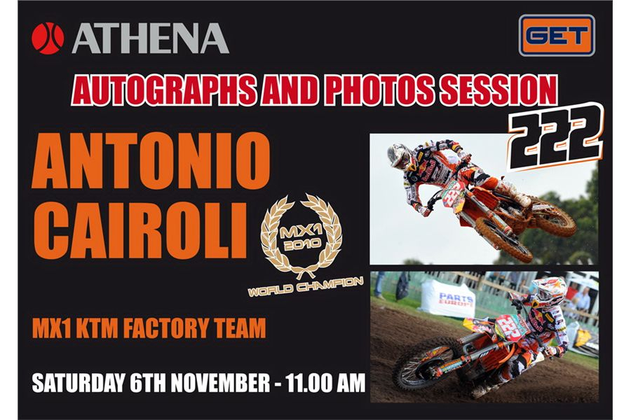 Rádi bychom Vás pozvali na autogramiádu mistra světa MX1 2010, Antonia Cairoli. Pro autogramy a fotografie si můžete přijít v sobotu 6. listopadu v 11:00 h, hala 10/C64 na stánek ATHENA.