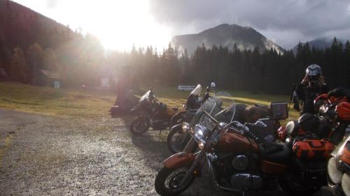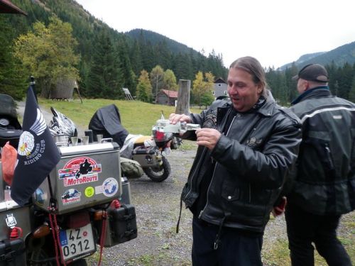 Vedoucí chaty nám vypráví o zdejších medvědech, kteří se před pár dny usadili na louce, jen pár metrů před chatou a byli zde téměř celé dopoledne. Byla to dvě mláďata a před obědem si pro ně došla matka. Tohle nemusí být právě bezpečné, protože samice se o své mladé většinou bojí a je schopna zaútočit ze strachu o ně. Však jsme taky ze zkušenosti motorky vyprázdnili ode všech salámů a jídla.