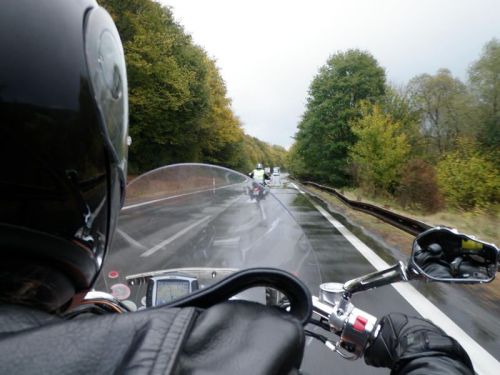 Ono by to snad i šlo, i na sjetých Mitasech, i s těžkým bávcem a kufry, kdybych nebyl debil a nedostal se do kolejí po traktorech... Tady to už bylo marné. Zahrabávám se a konec. Bohužel, z koleje nejde ani vyjet. Snažím se Báwo otočit proti svahu dolů, ale kufry brání. Navíc boční válce, ach jo. Po chvíli to pokládám. S pomocí Jora zvedám mašinu s kufry proti svahu a mažu dolů. To bude švanda, jak to jen ubrzdím, až se mi to pustí po blátě rychleji... Ale i přes sjeté Mitasy to na dvojku brzdí. Jasně že to nesmíte na svahu moc pustit, ale pořád to jde. Mitasy jsou dobrý.
