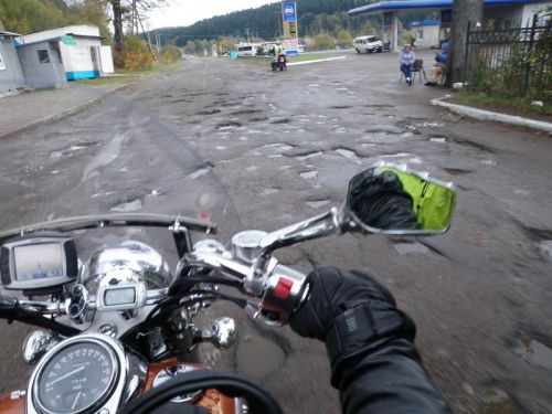 Pokračujeme a dalších šedesát kiláků nás zdržují krávy a ovce vracející se z pastviny. Projíždíme kolem nich pomalu a občas zastavujeme, aby se neplašily. Stmívá se, když dojíždíme do Novyj Bereznyj a z něj odbočujeme k hranici. Protože je zde pořád benzín za cenu rovnající se ceně tak trochu z motoristova nebe, dobíráme bandy do plna. Chceme platit kartou, což problém není. Problém je způsob. Dáma za sklem od Vás kartu přebere a ptá se na PIN. Vy jí ten PIN musíte přes sklo přehulákat a protože sklo je hrubé, tak moc nahlas a ona vám pak k potvrzení Vámi vyřčeného čísla ukazuje na prstech každé to číslo zase zpět. Ty vado, tak tohle je věc! No, ještě že nepatřím k „vatařům“, to bych pak asi nemohl spát, ale i tak si pro tyhle účely pořídím raději rezervní kartu. Docela legrace a alespoň v naší skupině už si známe své vlastní piny, ha,ha,ha… Takže kdybyste někdo zapomněl…? :-)))