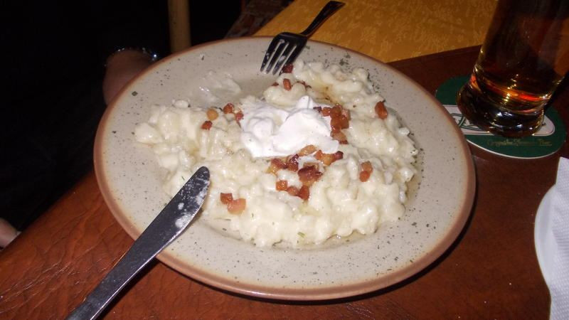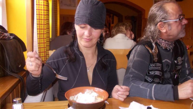 Dáváme si jídlo - plněný řízek s bramborem a dršťkovou polévku, vše za tři eura. Není možno si tohle u Janka nedát. Jídlo skvělé a polévka zahřeje. Najezení, spokojeni, loučíme se a vyrážíme dál.