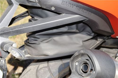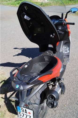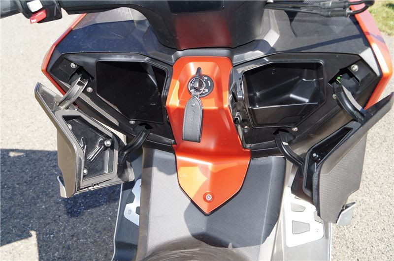 Nespornou výhodou skútrů je velký úložný prostor pod sedlem. Zde se vám v pohodě vejdou dvě přilby. Jedna do standardního úložného prostoru a druhá do vyklápěcího a prořezání odolného vaku Flexcase nad zadním kolem. Pokud byste náhodou zapomněli, že máte vak vyklopený, nebudete moci nastartovat a kontrolka bude signalizovat jeho zatažení.