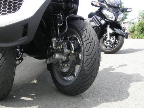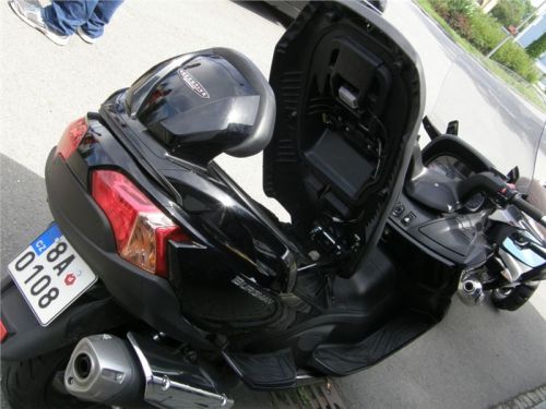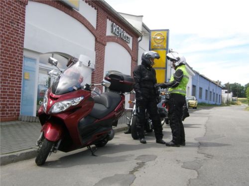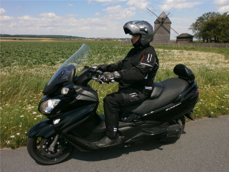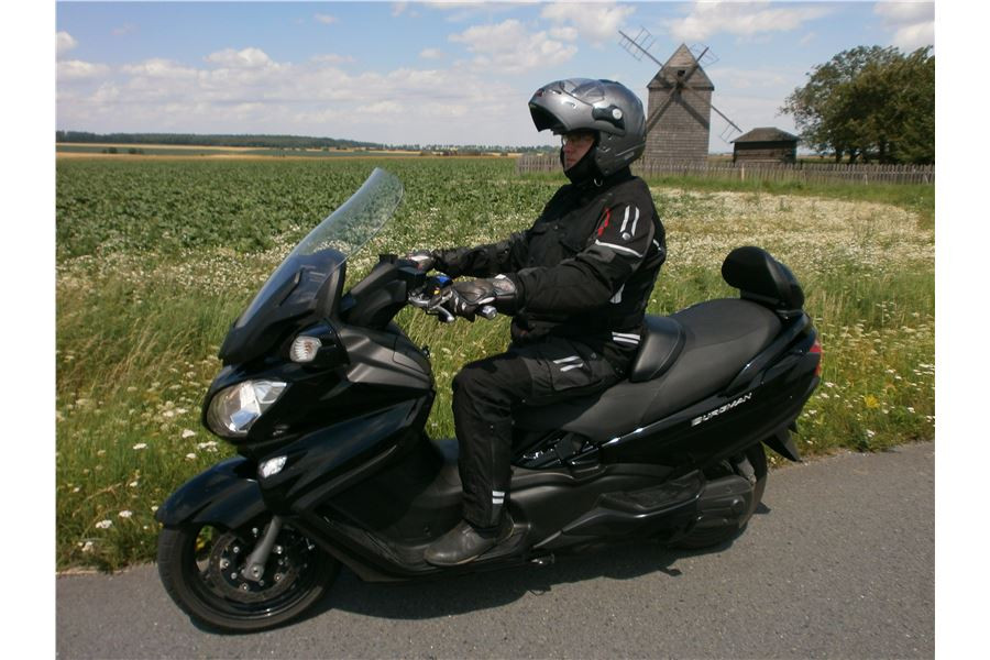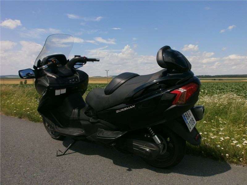 Burgman je rychlý, komfortní podvozek má na zadních pružinách nastavitelné předpětí a lehce s ním atakujete nejen dálniční rychlosti. K bezpečnosti všech je proto vybaven systémem ABS a dvojitou kotoučovou brzdou a při své pohotovostní hmotnosti 277 kg brzdí dobře. Ne však při porovnání s novým V-Stromem. Ten opravdu brzdí super skvěle.