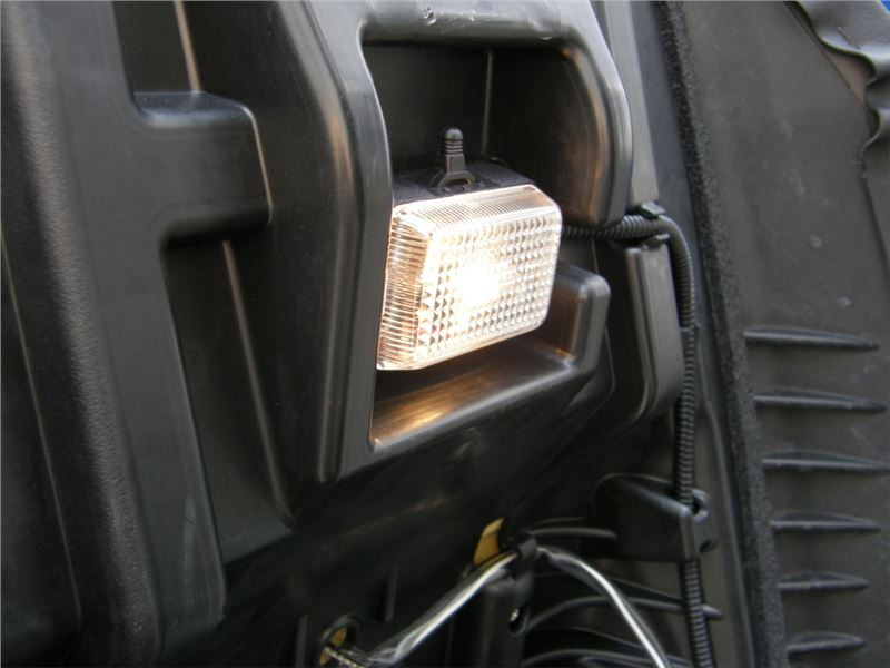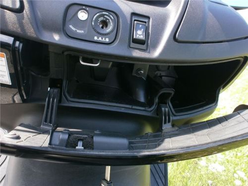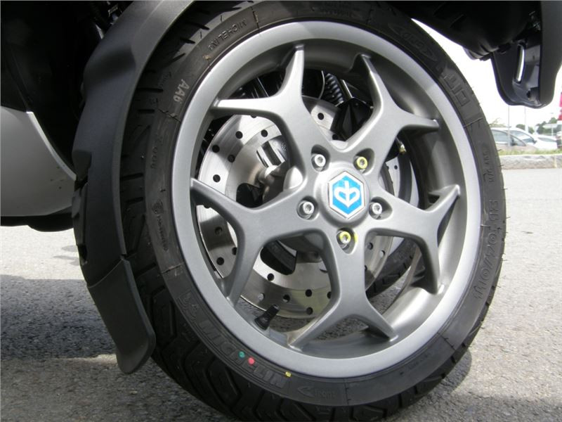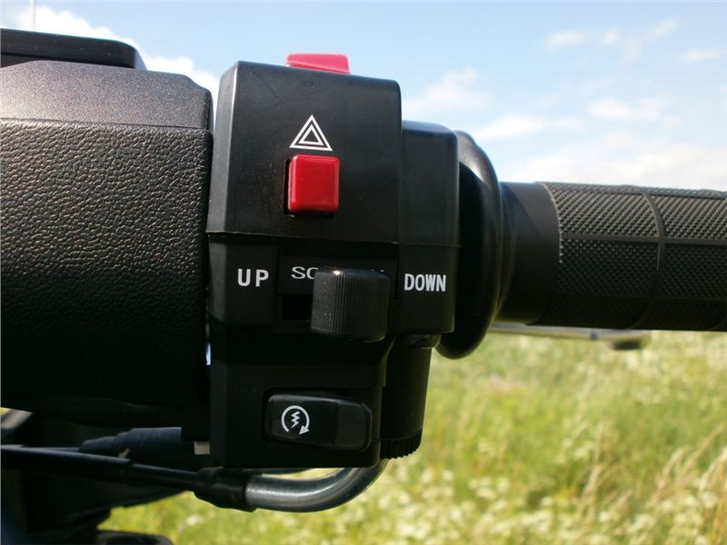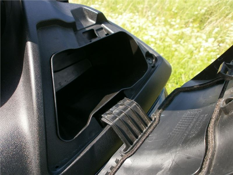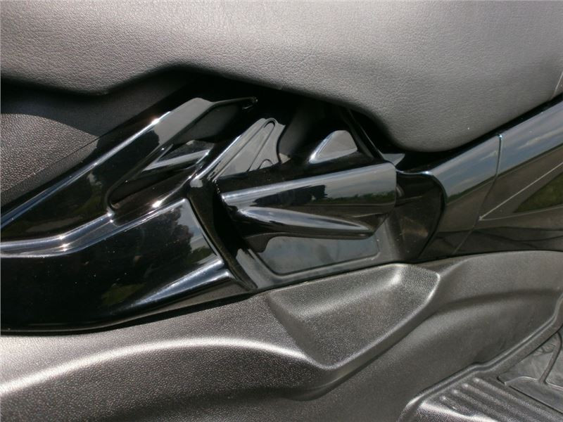 Karoserie před koleny je doplněna třemi prostornými přihrádkami, kdy ta hlavní a největší je vybavena také zámkem, po levé ruce pod řidičovým sedlem je pak pěkně zakomponováno táhlo ruční brzdy.