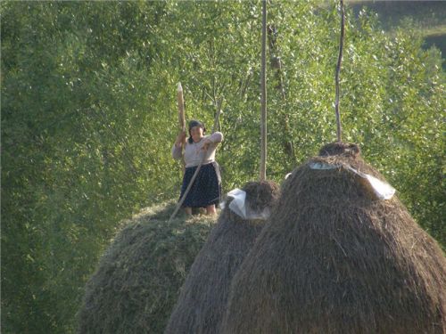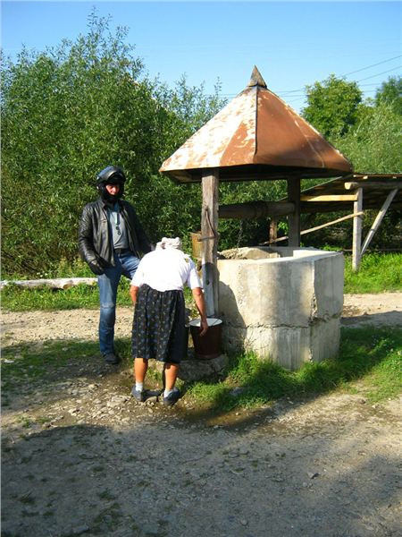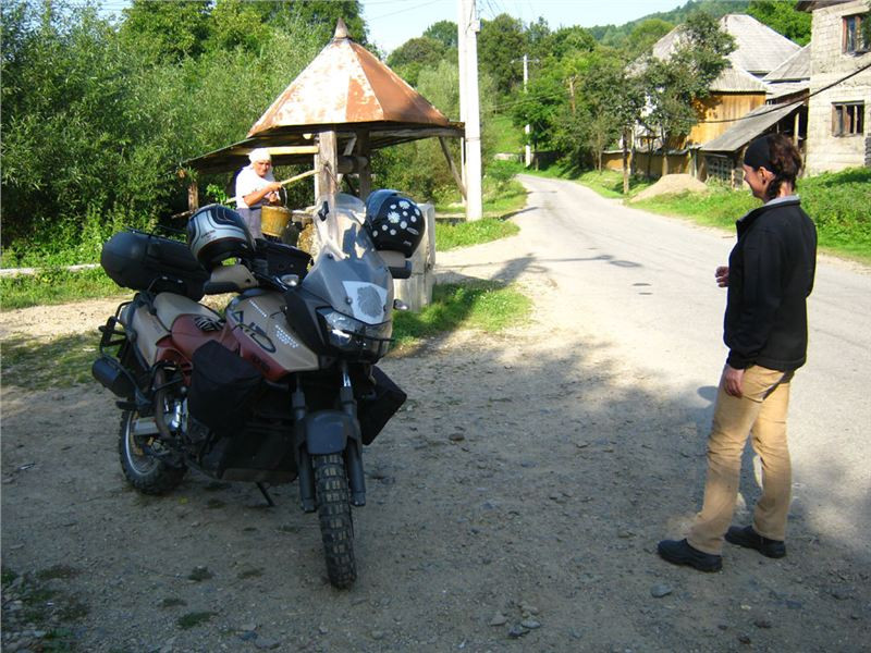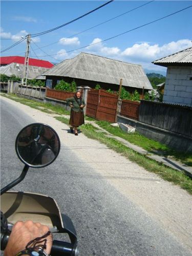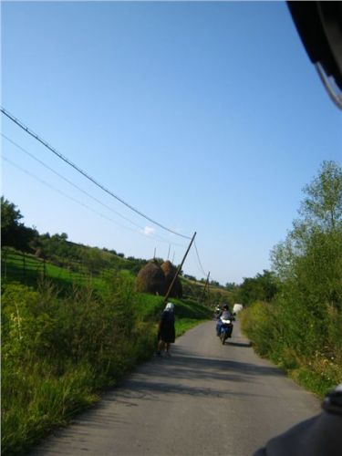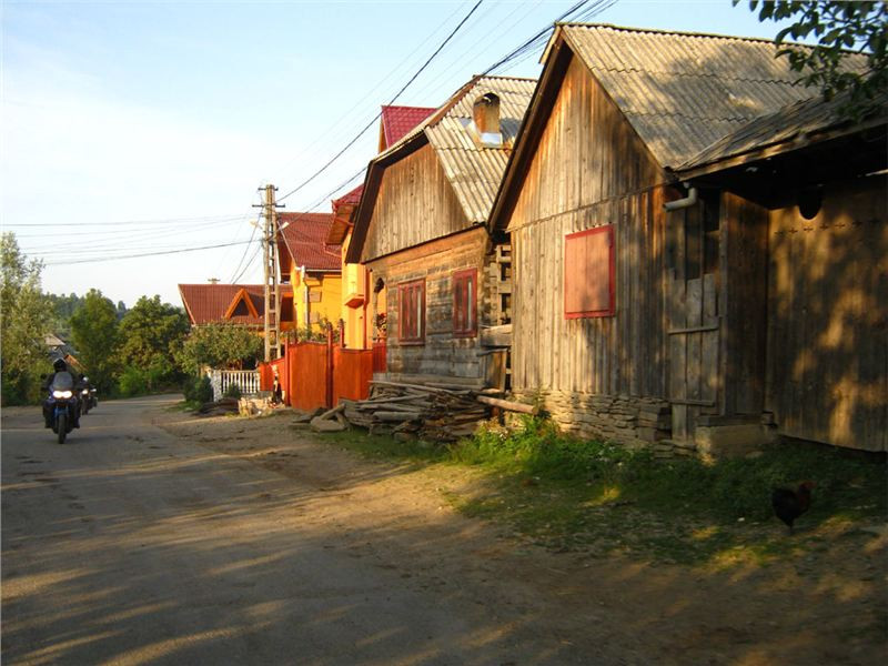 Přes další hřeben se docela slušným makadamem přehoupneme do (zřejmě „střediskové“) obce Botiza, kde to s nadcházejícím večerem začíná žít. Místní se vracejí s cajkem přes rameno z polí a pastvin, z kopců schází jakási treková výpravička, před krámky už sedí pár chlapů s lahvoněma, ženský shání slípky a kravky, no a jako třešnička na dortíku jsme tu my, „jinoplanetníci“ na nezvyklých strojích :-).
