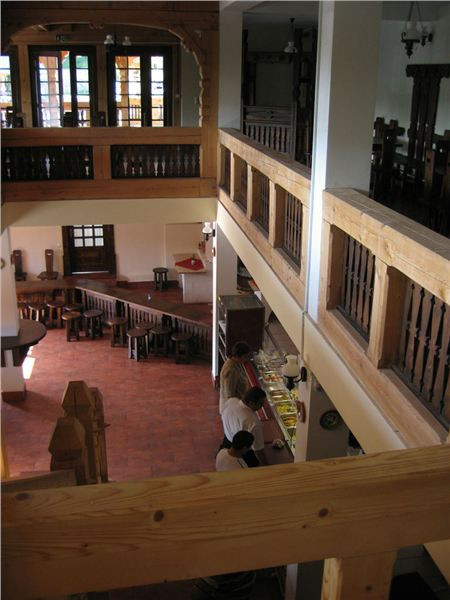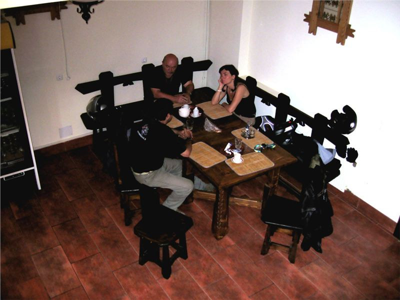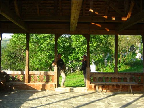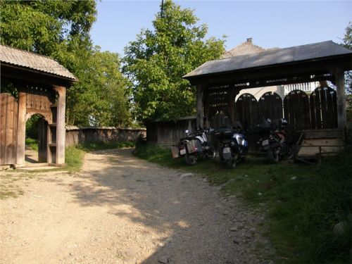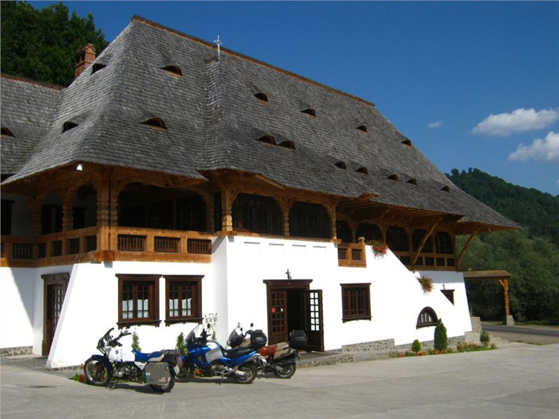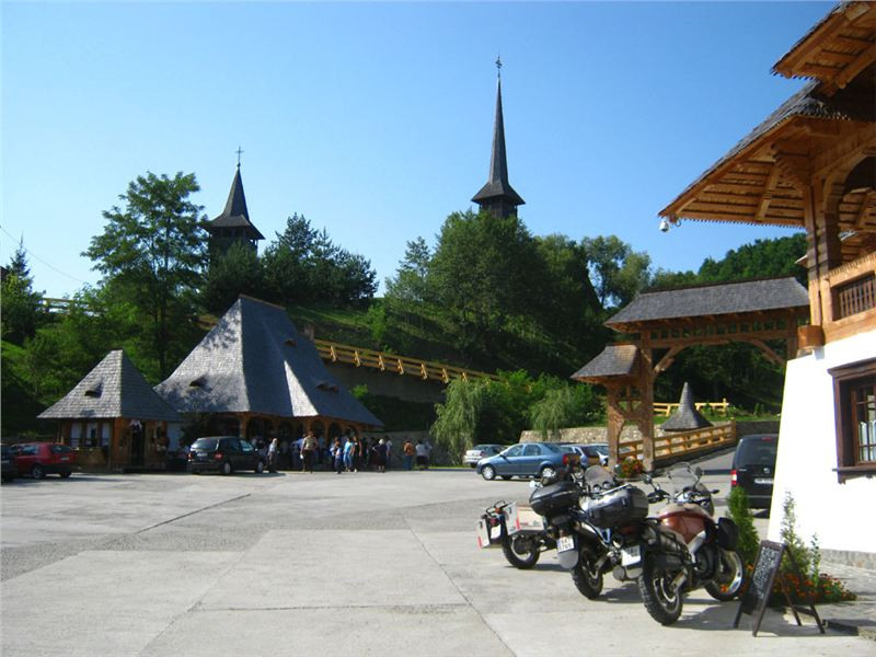 Protože už tluče poledne a dnešní vedro je značné, dojedeme do Bârsany k již ze včerejška známému klášternímu komplexu. Ne, není se třeba obávat, že naše příchylnost východnímu křesťanství dosáhla té míry, že potřebujeme repete, alébrž usoudíme, že si popřejeme obědu v klášterní restauraci na kraji parkoviště. Odstavíme mašiny a s potěšením unikneme do přívětivého chládku restaurantu. Je již zdá se po hlavním náporu hladových návštěvníků (jsou skoro tři odpoledne :-)) a je prakticky volno. Obsluha je samoobslužná, u pultu si každý ukáže co mu libo, zaplatí na konci u kasy a odnese si svou menáž ke stolu. Jediným nedostatkem je absolutní absence nějakého textu k nabízenému sortimentu, a obsluha (částečně řádové sestry) není schopná ničeho než rumunštiny. Tak zariskujeme a každý si prostě intuitivně vybere. Opět se ale projeví, že špatně si v rumunské stravovně vybrat prostě nelze, každému to jeho chutnalo. Po pravdě, nejvíce chutnalo chlazené lahvové – neměli „frííí“, tak halt trochu zhřešíme a dáme po jednom normálním, míníc, že se alkehol z nás nejspíše vypaří tak rychle jako když se plivne na rozpálenou plotnu :-). Strávíme zde fajn hodinku, vychladneme a jsme schopni se konečně vydat za dřevěnými kostelíky.