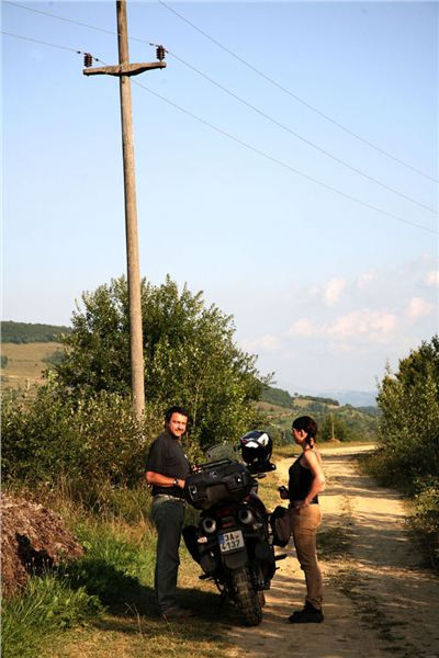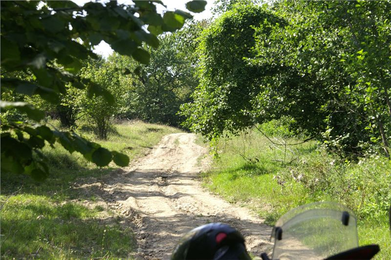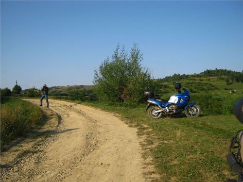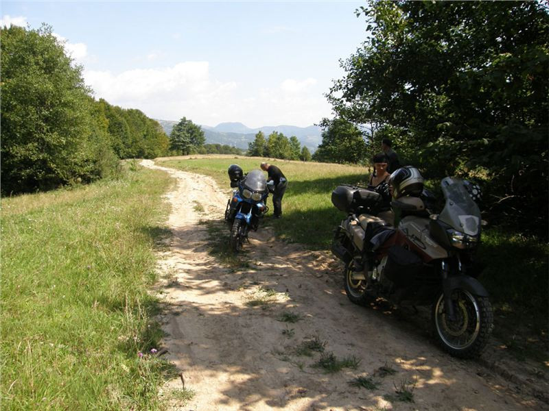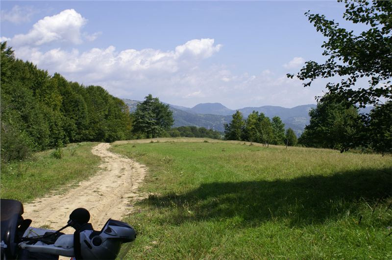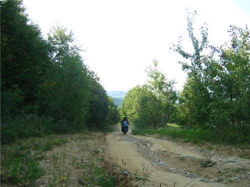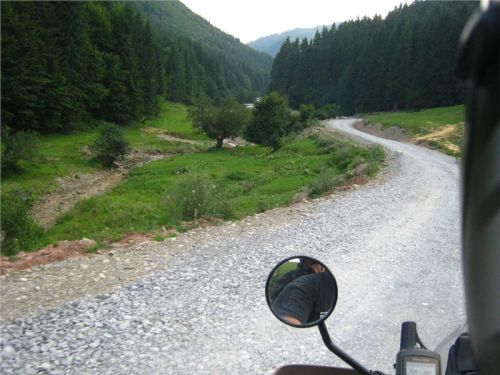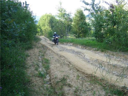 Další odbočku ve stoupání a serpentínách za Petrovou mineme, až posléze Ranža jako jediný majitel jakés takés mapy v GPS zjišťuje, že jsme ji jaksi minuli. Otáčíme a vracíme se na místo činu – no, v našich podmínkách by to byl vjezd na pole, zde to tedy značí okresku do vedlejšího údolí.