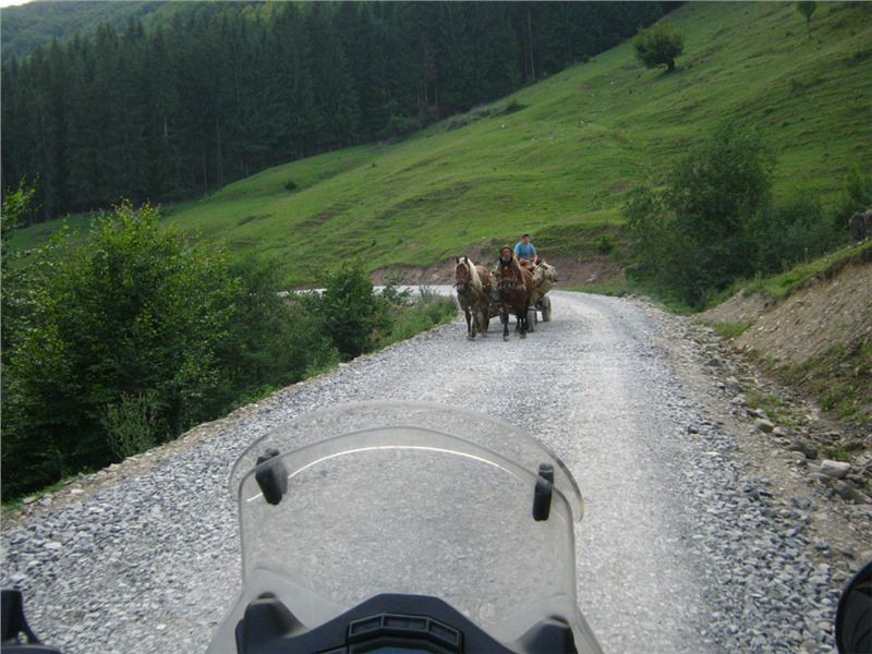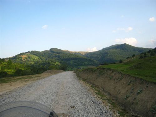 Tentokráte ale máme kliku. Cesta vykazuje statut oficiální rumunské silnice (tedy ukazatele a značky), kvalitativně je sice krůček, ale jen nepatrný, před předešlými, neúspěšně projetými kolegyněmi. Sice opět brutálně rozrytá ve stoupání, ale s trochou opatrnosti sjízdná. Naštěstí je sucho, za mokra by to byla jiná písnička :-(.
