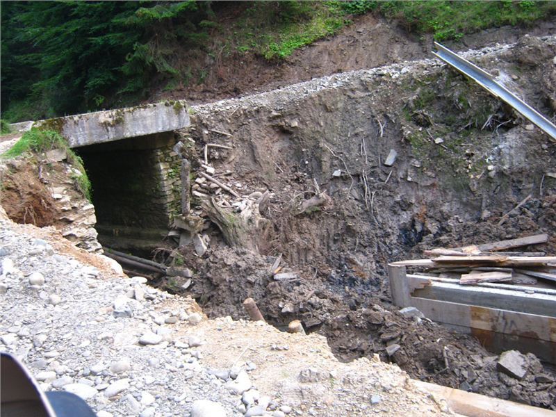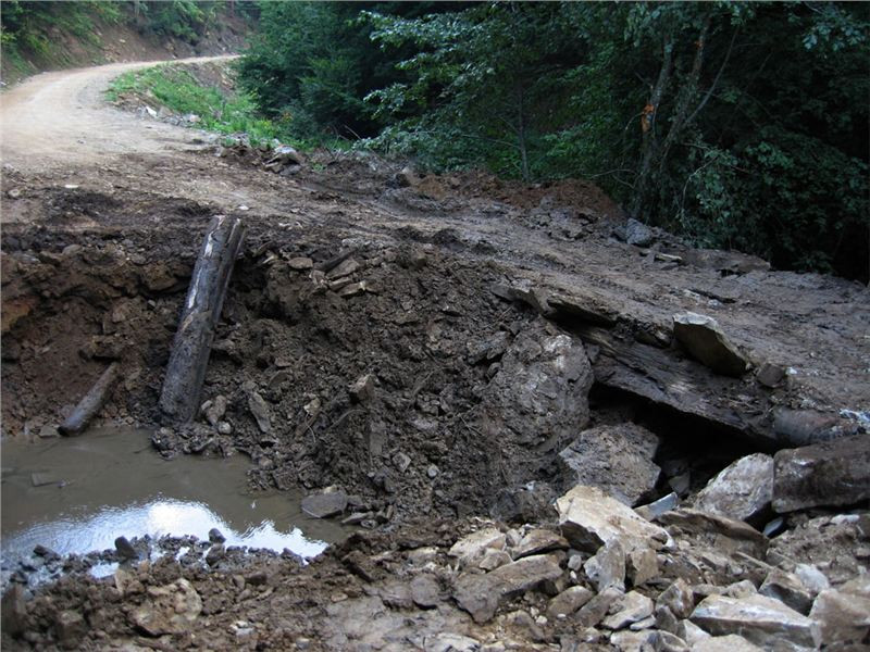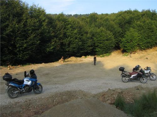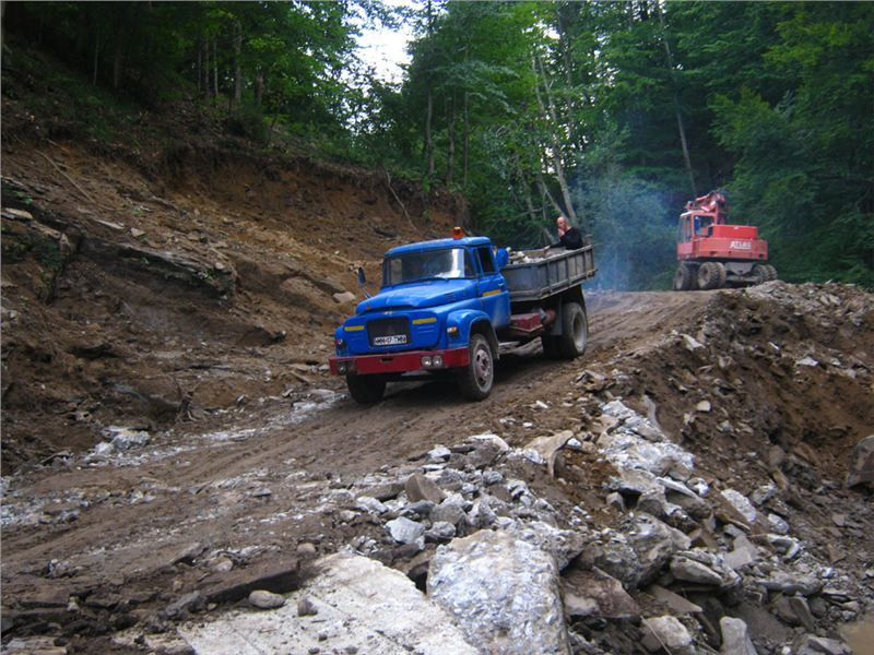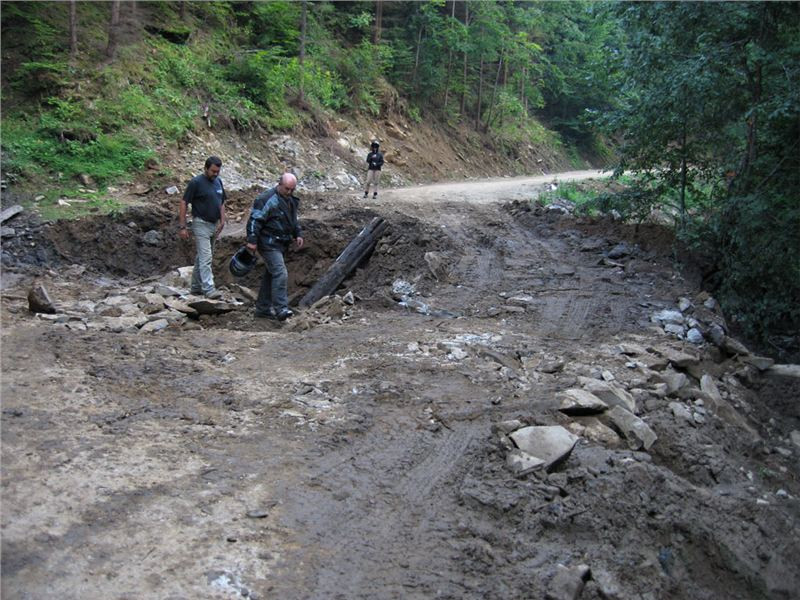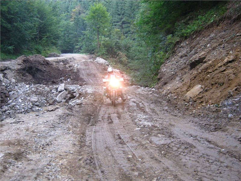 Že ale práce až tak nepokročily, zjistíme, jakmile zajedeme do lesů. Normální vozovka je už podkladově hotová, co schází, jsou drobné stavby jako mostky přes souběžný potok, opěrné zdi, a tak podobně. Tyhle úseky jsou čirá stavba, pojížděná a formovaná těžkými náklaďáky, navíc prosycená všudypřítomnou vodou. Zde si musíme dát trochu majzlíka s malou obhlídkou před projetím, nikomu z nás se nechce někde zapadnout do bezedného bahna nebo nedejbože skončit někde mezi balvany v bystřině. Ale všechny nástrahy nakonec překonáme a zastavíme v sedle průsmyku.