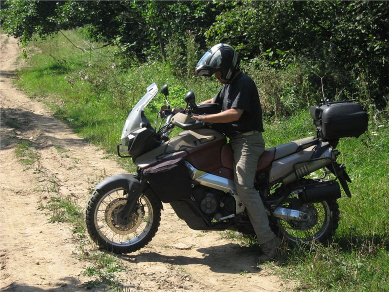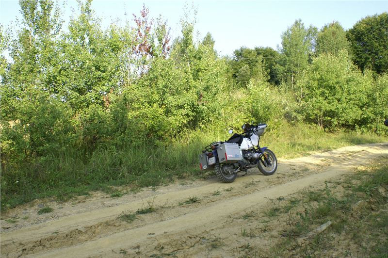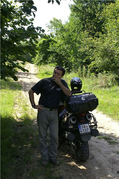 Takže dáme lehký oraz a poradu, co a jak. Podle jediného podkladu, tedy Ranžovy e-mapy, jsme nad požadovanou cestou, a ta, na které stojíme, vůbec podle mapy neexistuje:-). Ranža převezme iniciativu a vydá se sám (Janu nechá u nás) na průzkum o kus níže. Po chvilce zmizí za terénní vlnou a ani jeho, jinak dost výrazný, motor už neslyšíme. Slabou čtvrthodinku se nic neděje, poté opět nejprve zaslechneme a pak i zříme vracejícího se explorera.