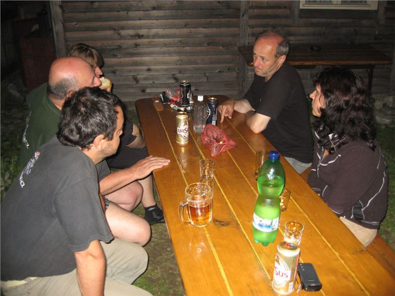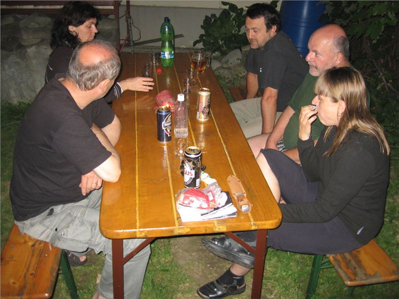 Vlčkovi ještě nejsou, ale než stačíme mít velké starosti, tak asi deset minut po nás doráží též. Je tedy čas na regeneraci organizmů, nasycení a posléze na velmi příjemné posezení za domem v pergole obklopené vinnou révou. Samozřejmě s místním pivkem v ruce. Dohodneme si program na zejtřek (díky vrozené lenosti dáme přednost turistickému spoji) a pak už se tlachá o všem možném. Dnešní prožitky a zážitky střídají hlubší zamyšlení o nesmrtelnosti chroustů a podobné důležitosti, večer se nese v lenivé pohodě doznívajícího dne plného poznávacích aktivit, prostě a jednoduše pohoda. Tohle, takovéto večery na společných dovolených mám rád, vloni zde jsem si jich moc neužil....